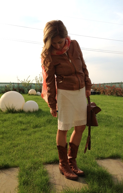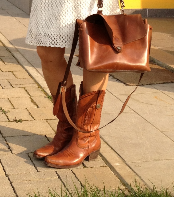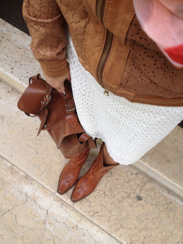 Oggi tema che spazia  dal cuio miscelato con  il merletto  arabescato di un abito bianco di Sinequanone  reso  esplicito in maniera forte da un eclettico stivaletto  texano!!
