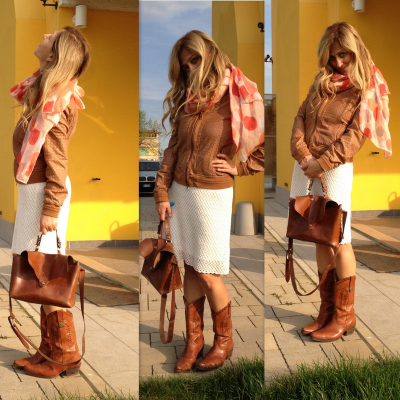 Ecco come far tornare à la page uno stile che richiama le fantasie del Texas in versione chic. Da usarsi per feste in campagna mah io l’ho indossato oggi in ufficio con un foulard di D_Onis a pois giganti che richiama colori caldi!