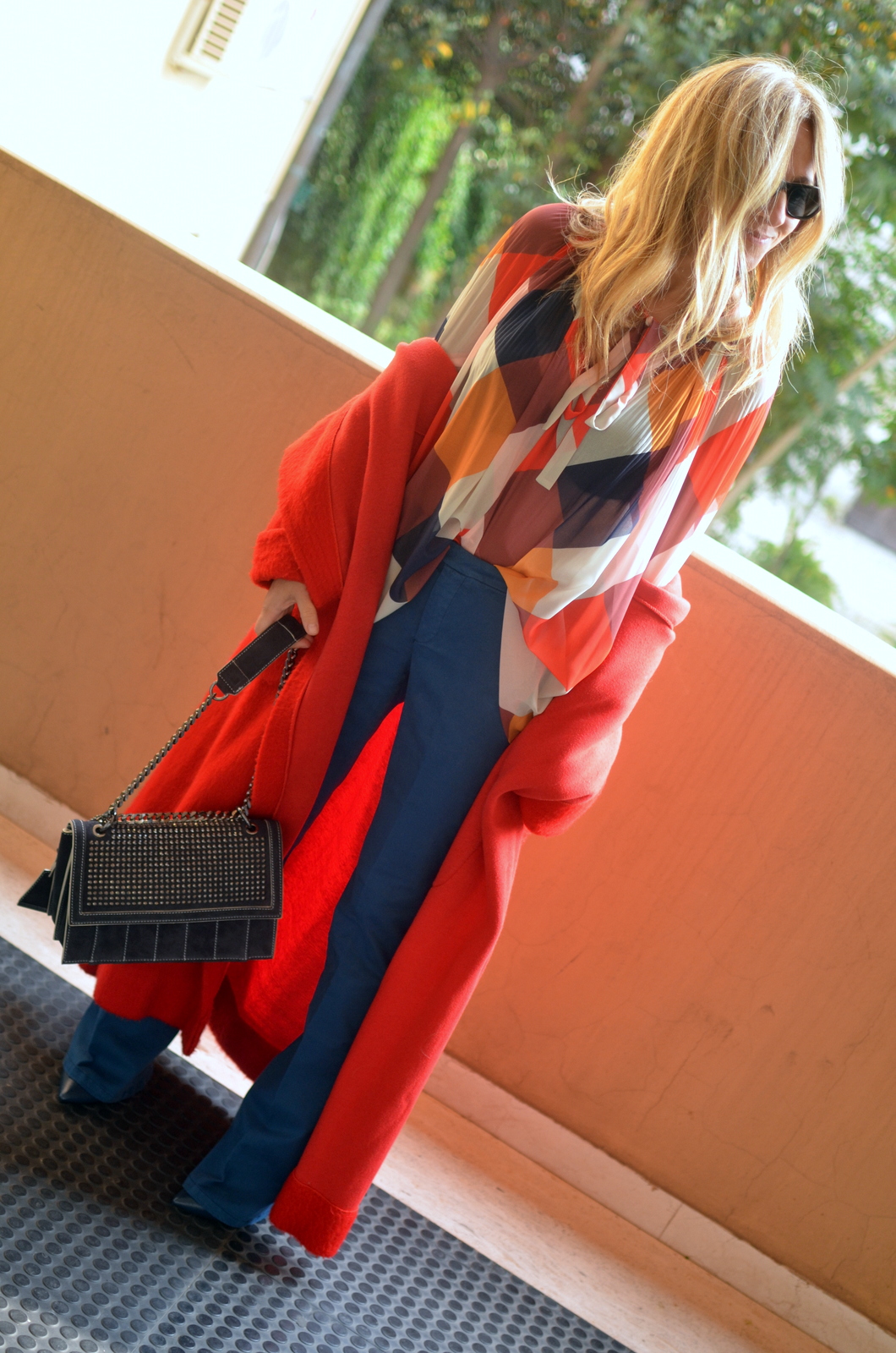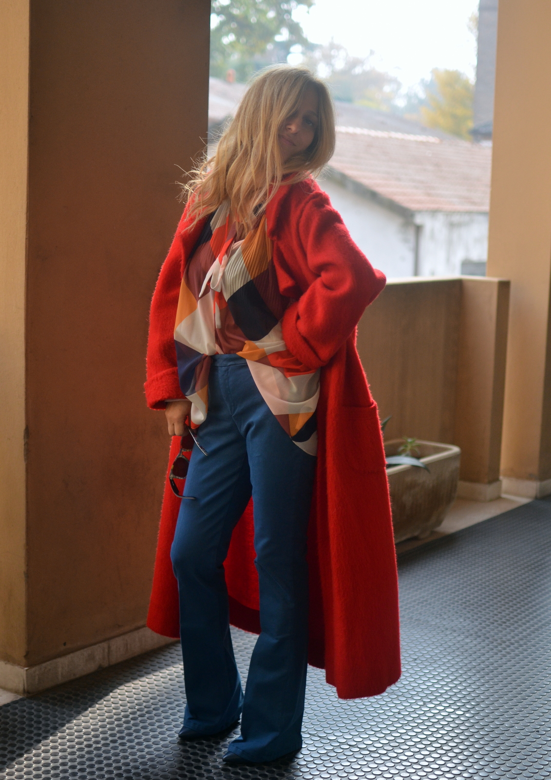 Nel mio look di oggi, dettagli che omaggiano gli anni Settanta con pantaloni a zampa e camicia in chiffon in fantasia optical nei colori caldi. Per un look romantico e dolce nelle variazione armoniche del rosso e del blu.