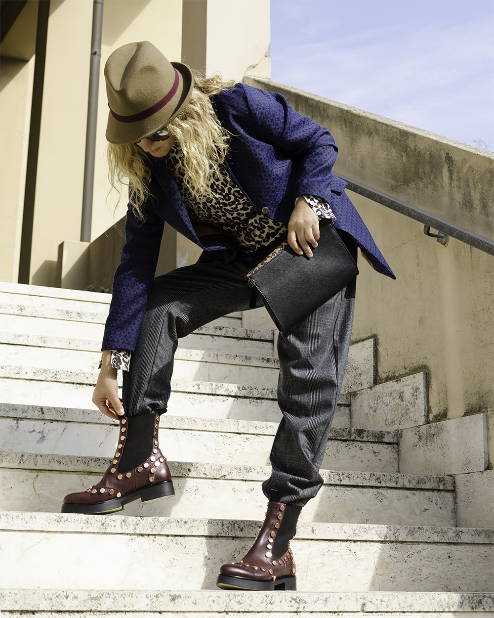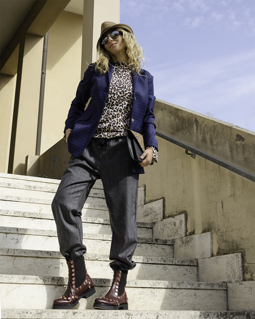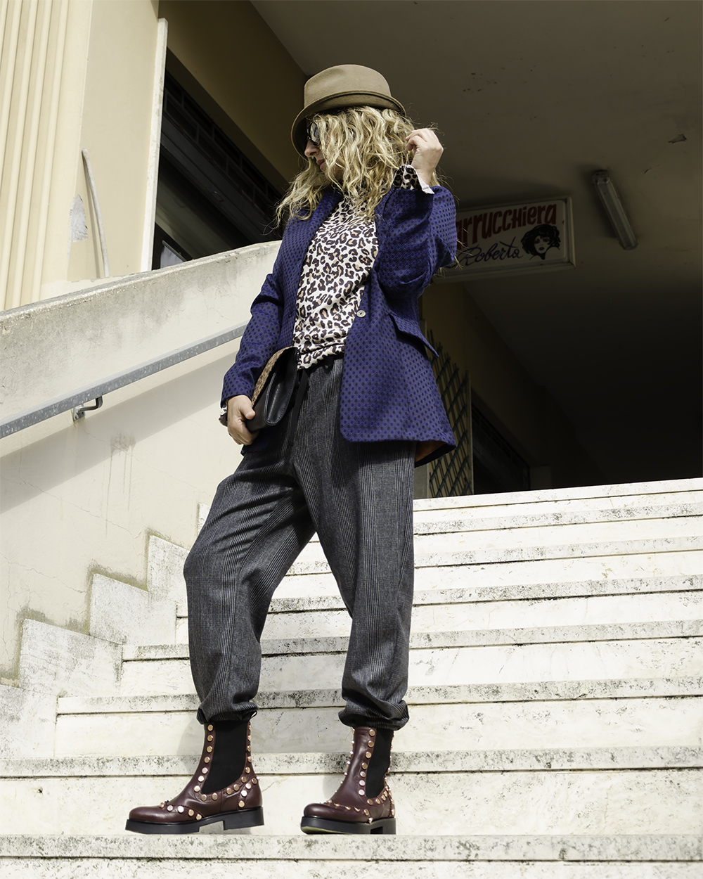 Questa scarpa diventa protagonista di un look importante. Come vedete la sobrietà non mi appartiene. Ho indossato un pantalone largo in Principe di Galles con coulisse e ho inserito le estremità negli stivaletti. Per un contrasto decisamente selvaggio ho abbinato un top animalier a manica lunga cui ho aggiunto una giacca blu in jacquard con mosaico floreale. Molto fluida, con maniche larghe dall’effetto retrò, per un capo unico nel suo genere, semplice ma prezioso, un capo dall’energia giusta e dalla grinta necessaria per domare il leopardo “quotidiano”. I capi si possono acquistare al Bounty Concept Store.