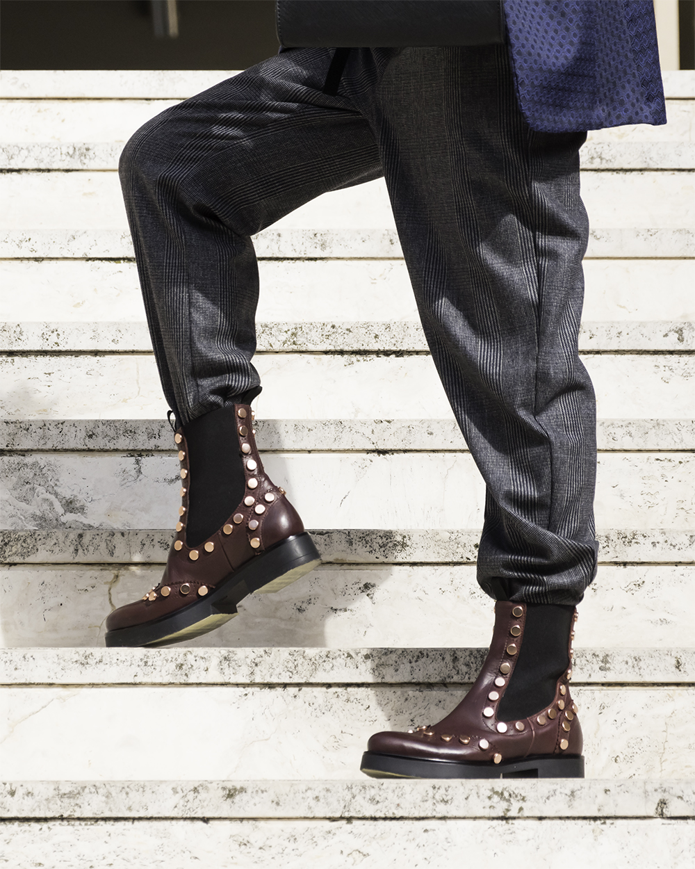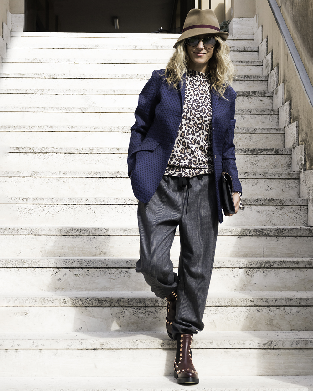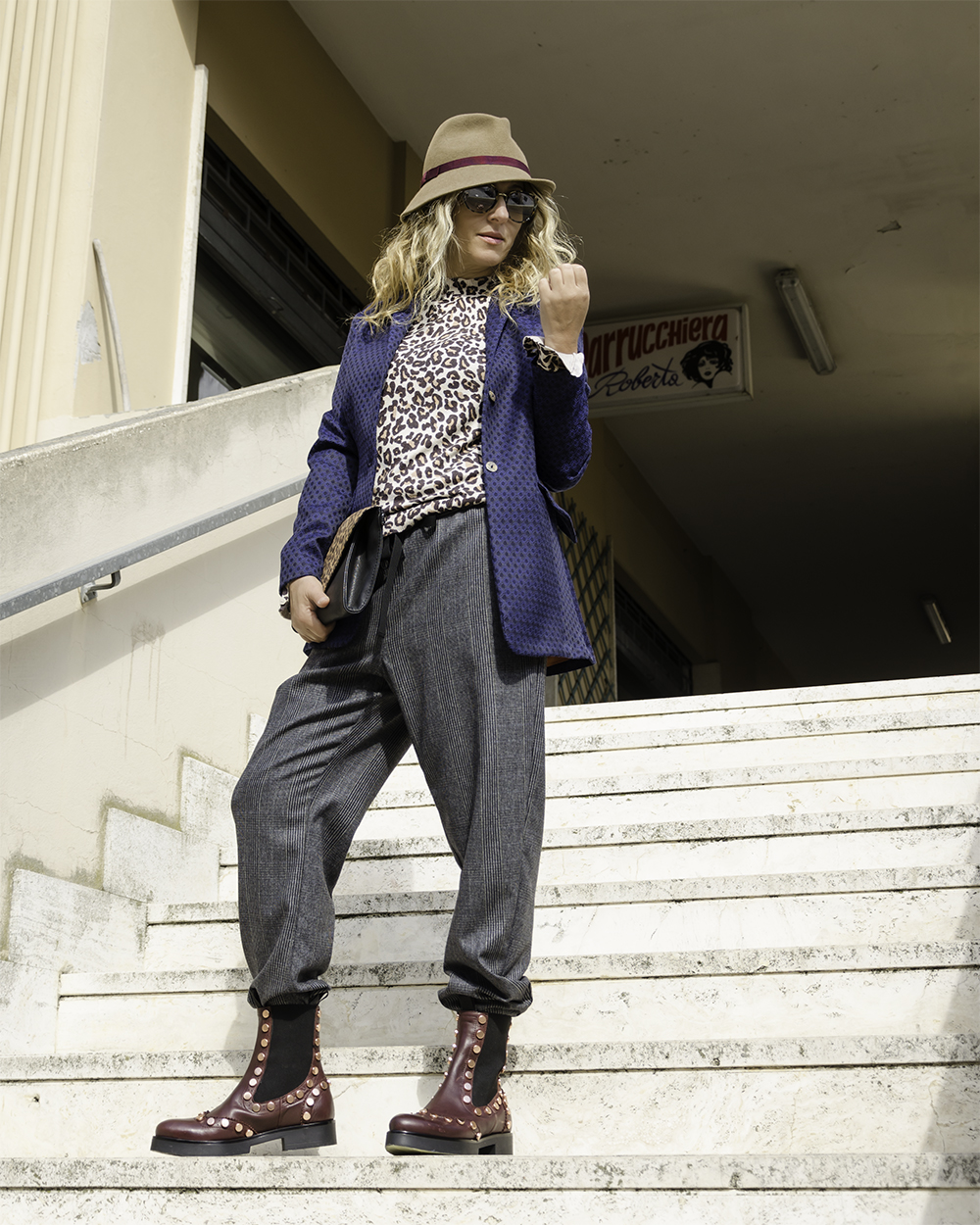 Questa scarpa diventa protagonista di un look importante. Come vedete la sobrietà non mi appartiene. Ho indossato un pantalone largo in Principe di Galles con coulisse e ho inserito le estremità negli stivaletti. Per un contrasto decisamente selvaggio ho abbinato un top animalier a manica lunga cui ho aggiunto una giacca blu in jacquard con mosaico floreale. Molto fluida, con maniche larghe dall’effetto retrò, per un capo unico nel suo genere, semplice ma prezioso, un capo dall’energia giusta e dalla grinta necessaria per domare il leopardo “quotidiano”. I capi si possono acquistare al Bounty Concept Store.