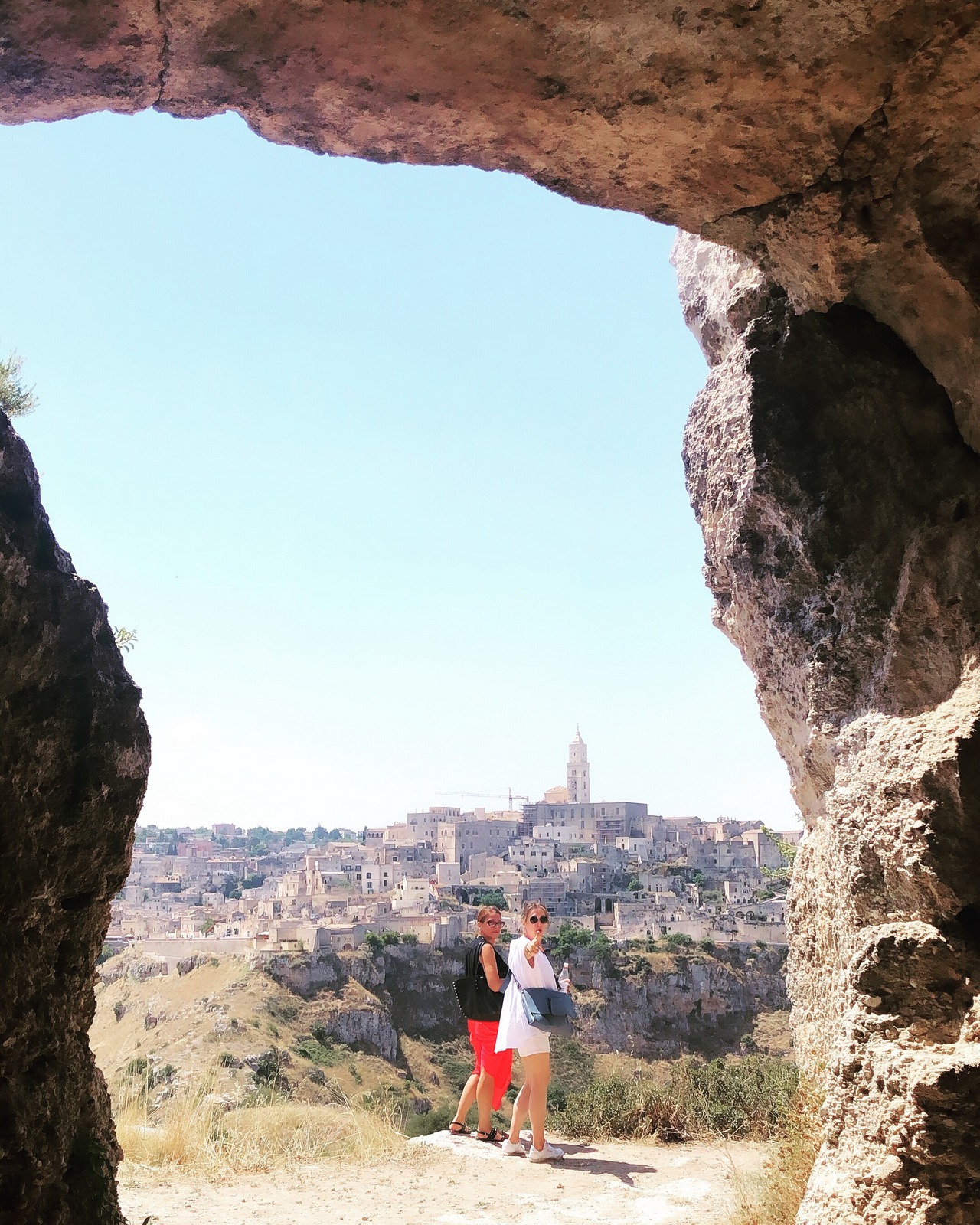 Marilena ci ha portate a vedere Matera da un’altra prospettiva. Siamo salite sulla sua auto e dopo una serie di percorsi sterrati siamo arrivati su, fin sulle rupi per ammirare da vicino valli e grotte e natura selvaggia e dirupi scoscesi, cielo azzurro e 40 gradi. Io non c’ero mai stata prima!