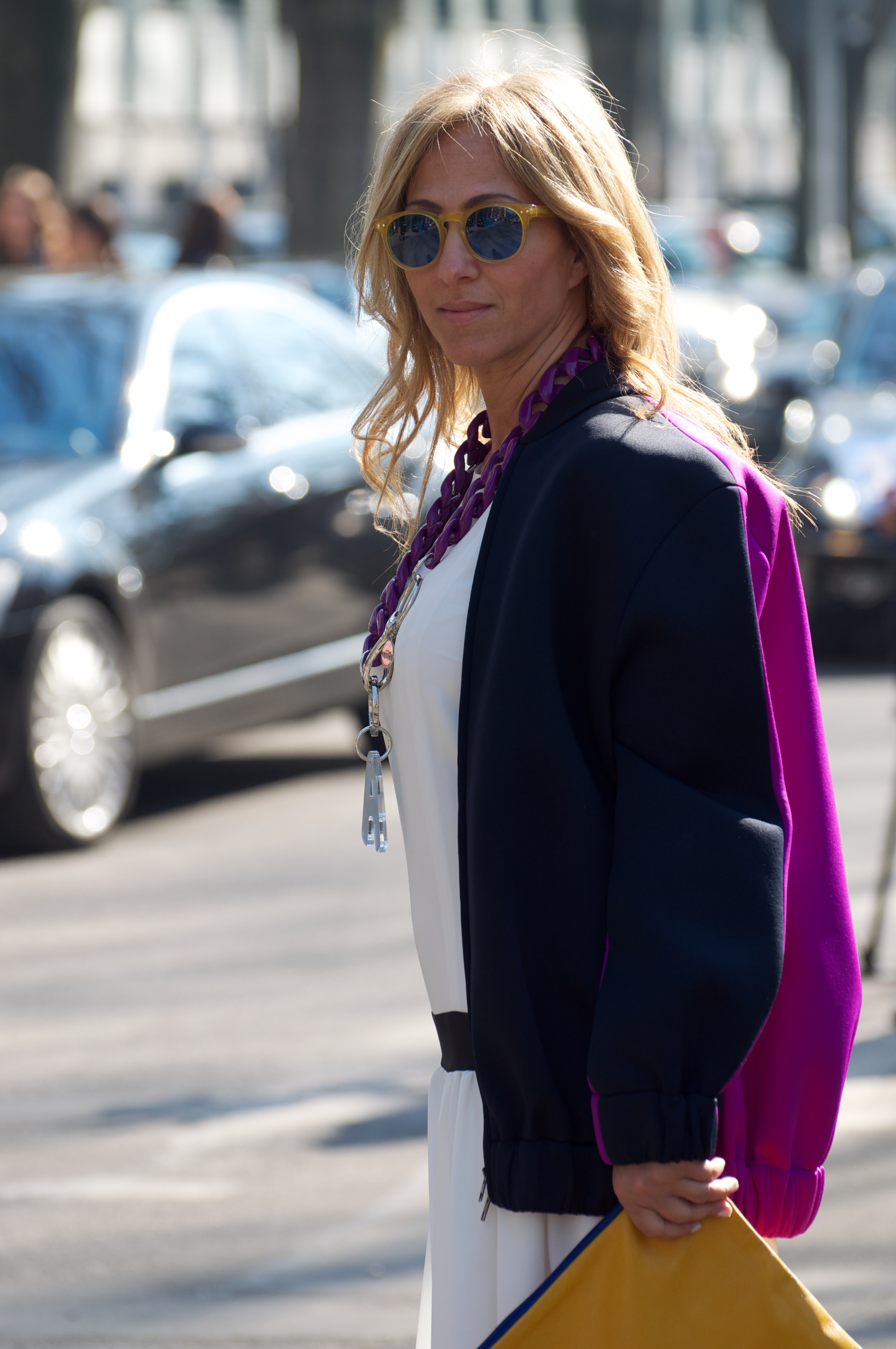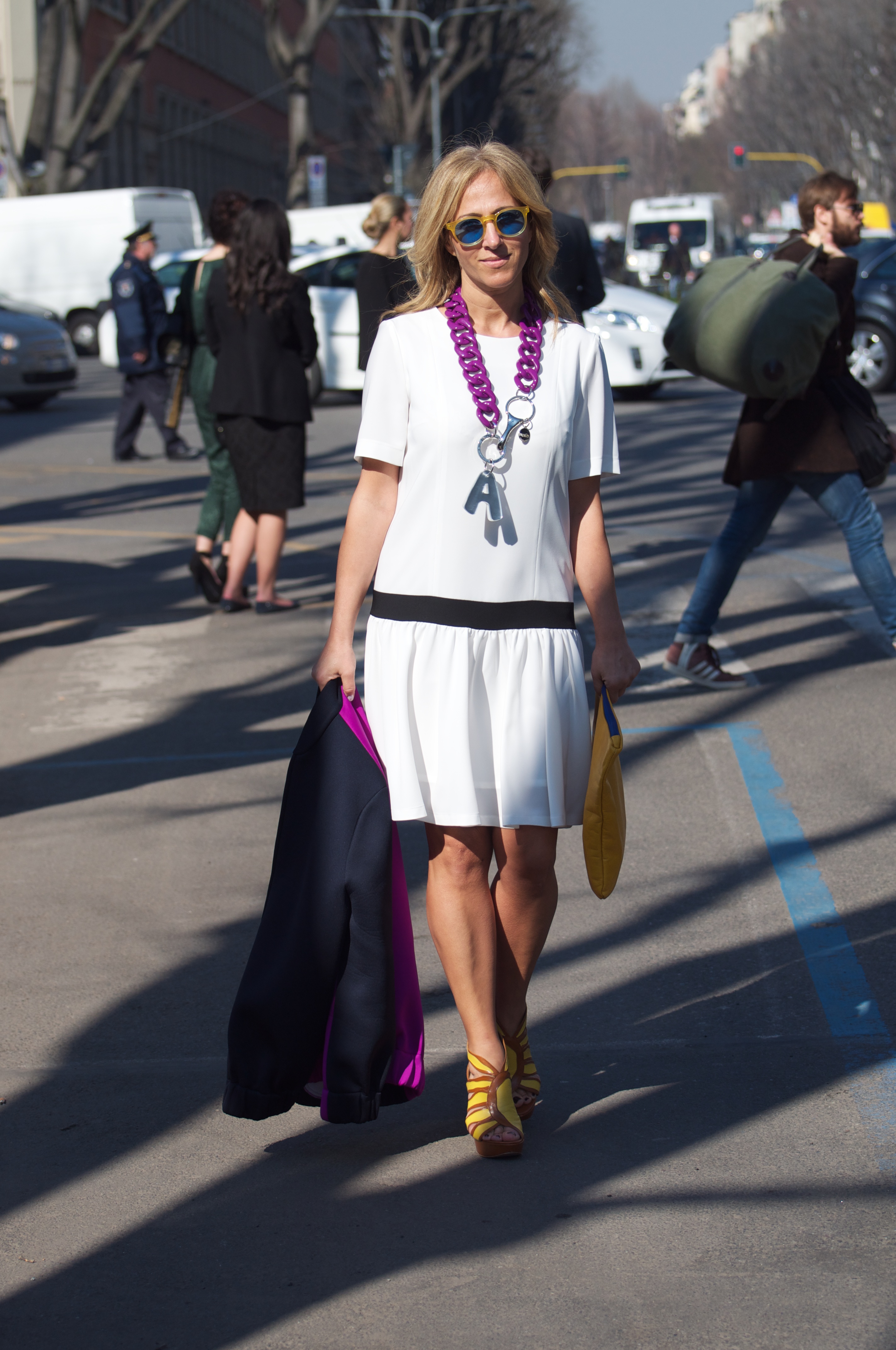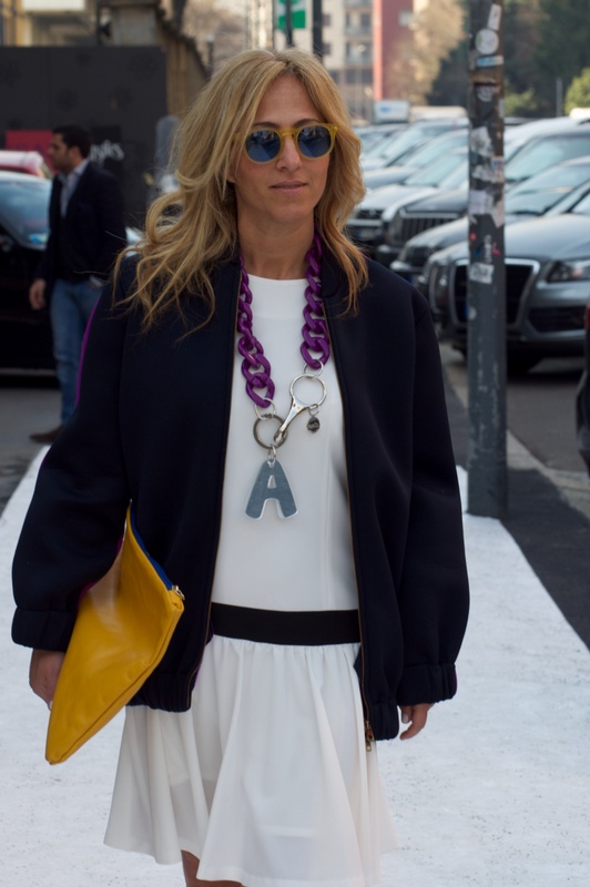 Eccovi un abito bianco, una tela su cui disegnarci sopra. Con un bomber in neoprene un maxi collana e pennellate di giallo ho dipinto il outfit da fashion week. Grazie Sofia!