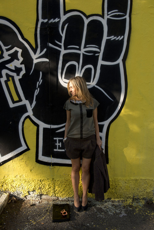 Eccovi un’altra 2Bshirt dal taglio e dal colore militare con il colletto tempestato di paiellettes. Vi avevo introdotto un pò di outfits QUI e dopo l’outfit con la prima parte dei graffiti, eccovi un secondo abbinamento. Cosa ne pensate?