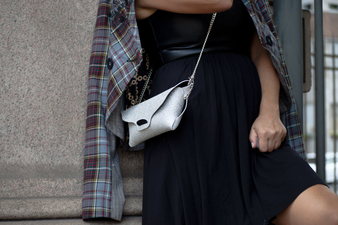 Outfit originale e un po’ eccentrico. Il vestito è bellissimo, sexy e grintoso, particolare, mi piace molto anche la borsa e il dettaglio del colletto glitterato