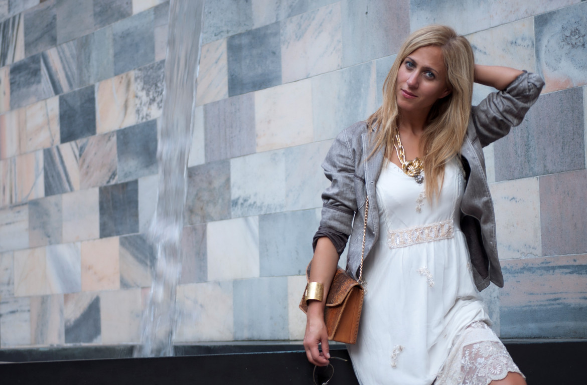 Interpretazione in chiave moderna dell’intramontabile bellezza del tulle ricamato in questo morbido abito bianco avorio di Elisa Cavaletti. Indossaro durante la mia MFW.  La leggerezza di questo abito sta nella naturalezza dei tessuti. Sovrapposizioni di tulle e cotone impreziositi da accessori di grande pregio e qualità come il bottone centrale con tre chicci di madreperla o come la lavorazione minuziosa precisa ed elegante della cintura piena di paillettes le stesse che ritroviamo in alcuni ghirigori nella lunghezza dell’abito. Ho reso l’abito grintoso in un look urban cowgirl con lo stivaletto biker texano customizzato con cinturini e laccetti di Opyum.