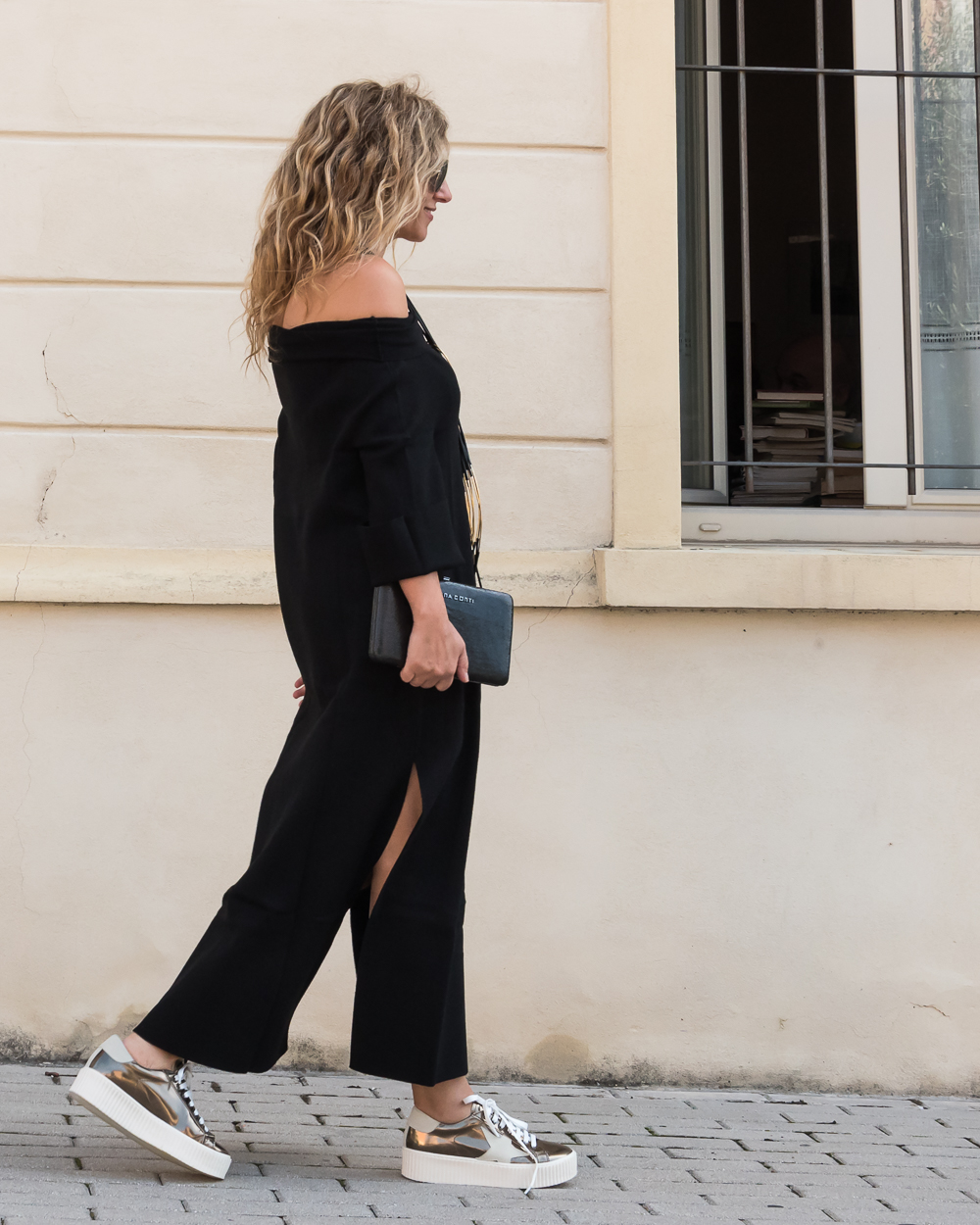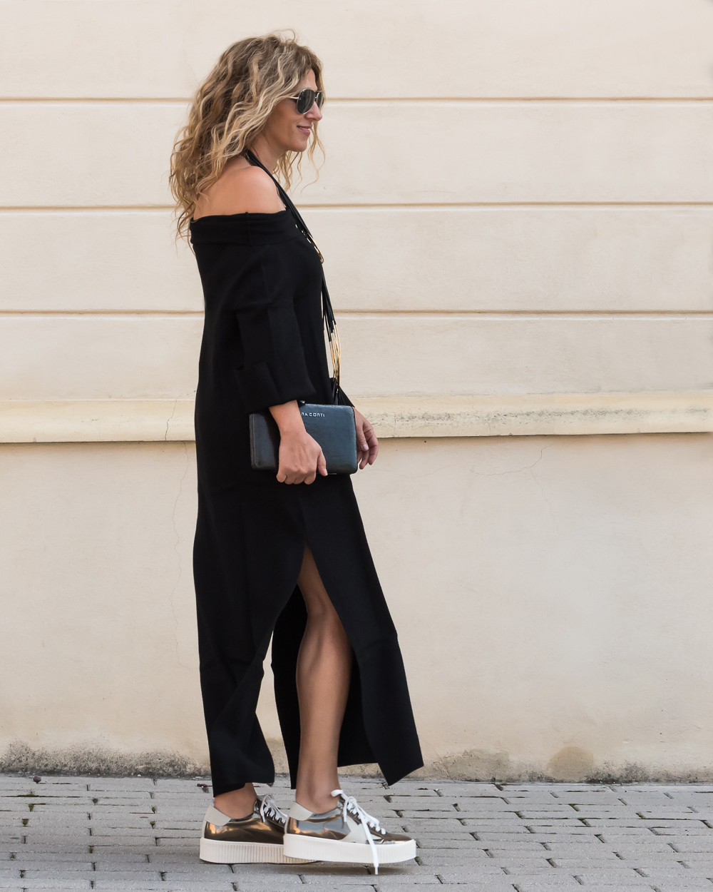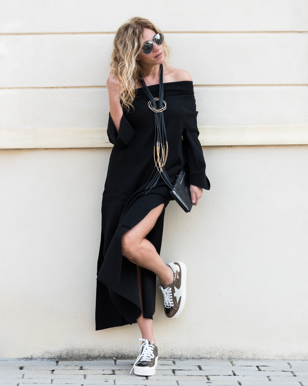 Proviamo ad abbinarle? Io le adoro con gli abiti lunghi ed eleganti. In questo caso, con l’aiuto della Stylist Cinzia Paolini e del suo Bounty Concept Store di Ferrara, ho scelto un abito di Liviana Conti. Oltre ai classici abbinamenti con pantaloni o jeans, ma sempre molto anomini e scontati, le sneakers a me piace indossarle con capi fuori luogo.