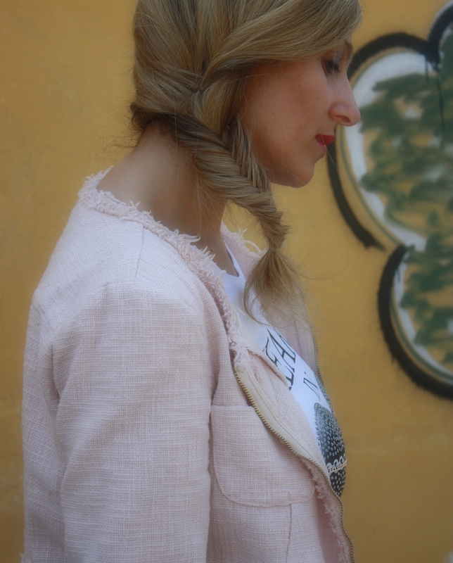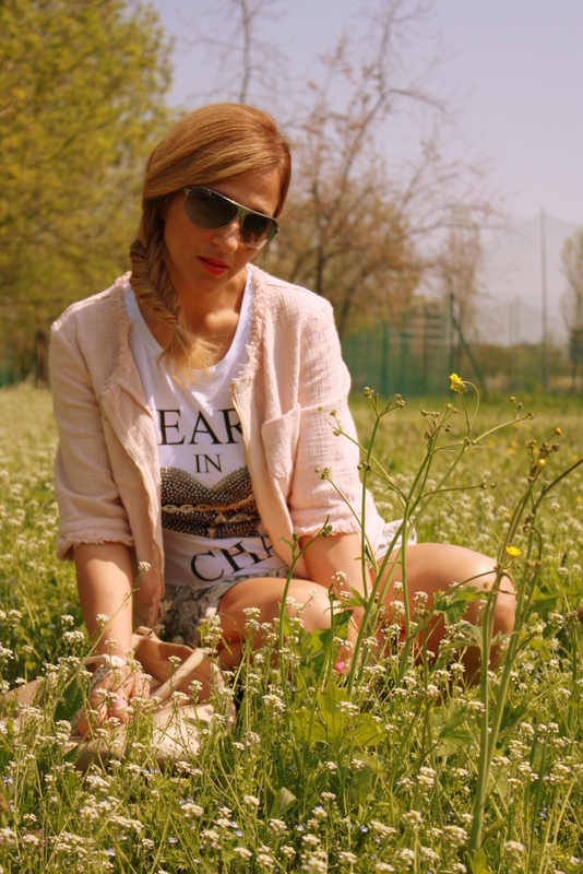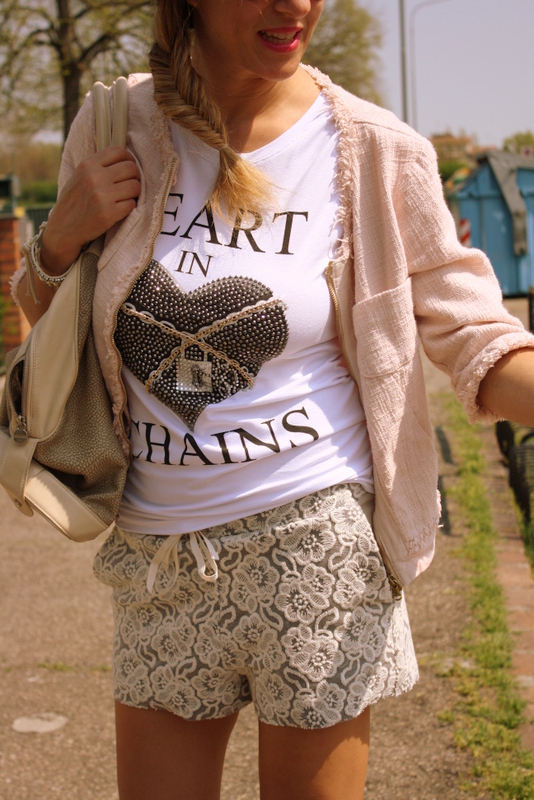 Anche io adoro i colori ma ho scelto un outfit più delicato che ricorda molto i colori pastello, con opacità illuminate dal bianco della tshirt, must di Northland, e dal bianco che risalta sui ricami grigi di uno short molto raffinato. Su tutto ho abbinato in netto contrasto una giacca tipo Chanel rosa cipria, con le maniche cucite ad angolo e con una zip davanti, davvero super confortevole!
