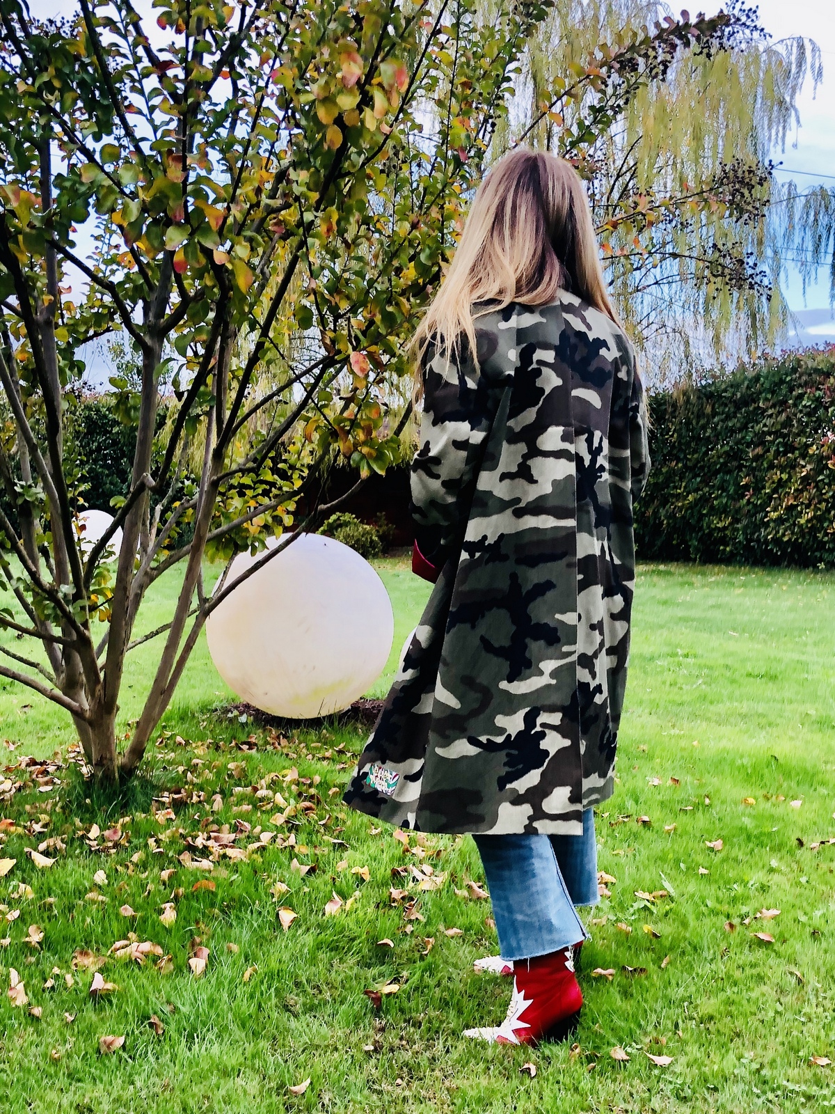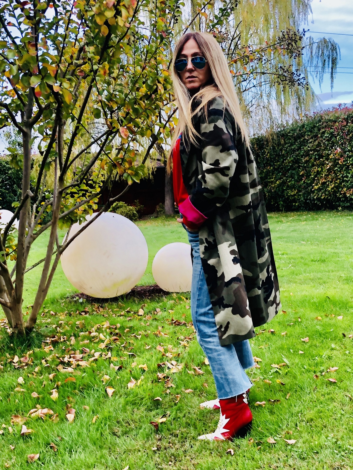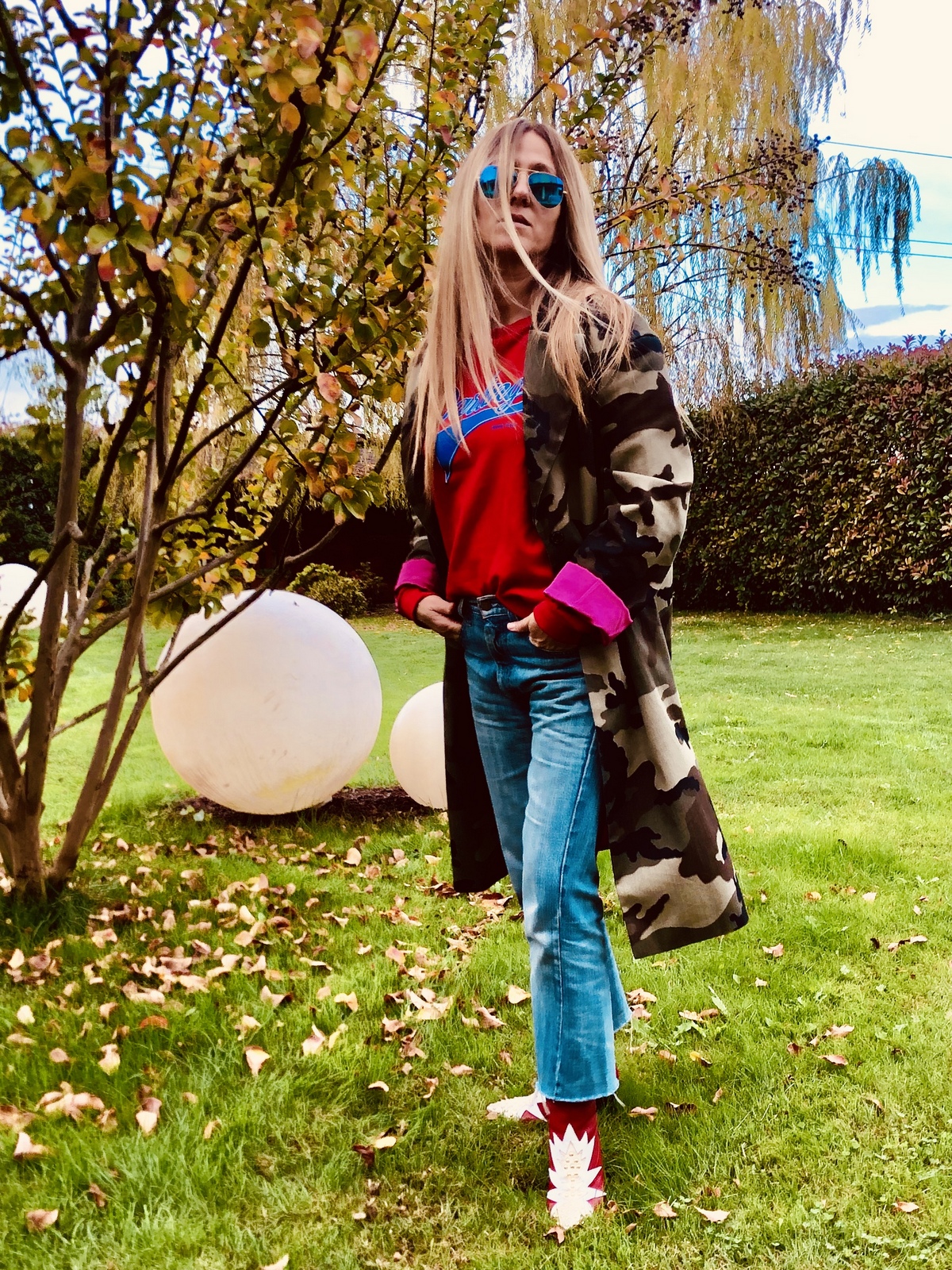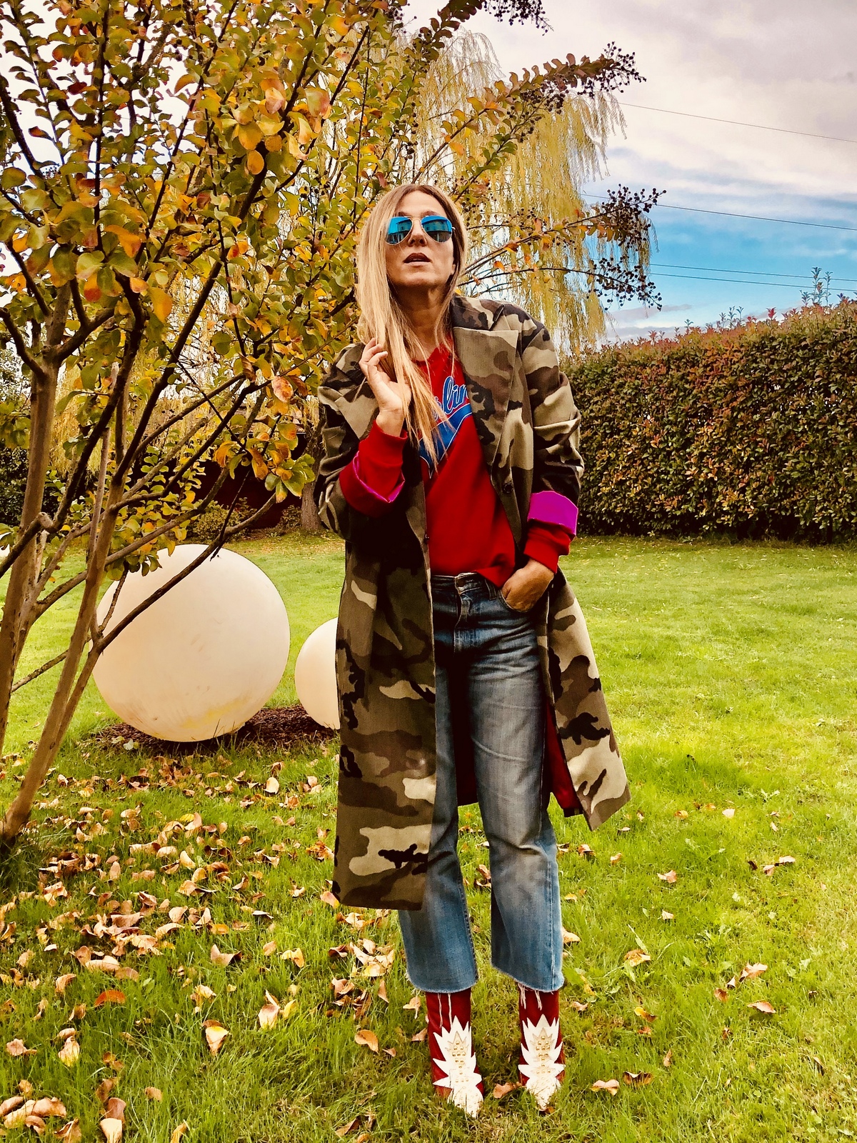 Oggi Denim vintage Levi’s, texani, camoufflage, felpa ed io che con stile solare e gioioso mi lascio fotografare da mia figlia.