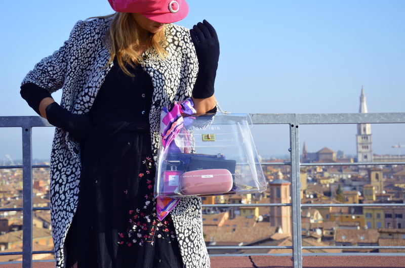 Non amo molto le borse trasparenti, ma questa è carinissima. Bello l’outfit, fantastici il cappotto e le scarpe. Unico neo, manca un po’ di calore nelle foto: farci vedere il tuo bel viso, no? : )