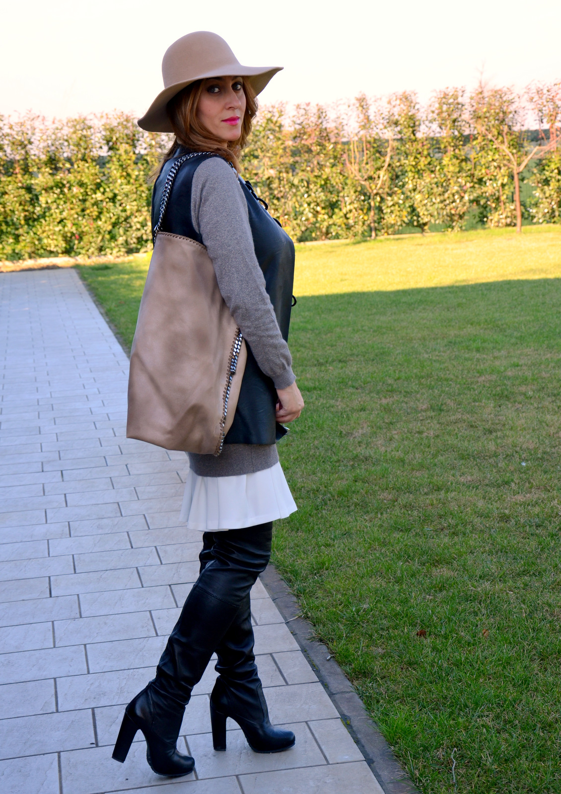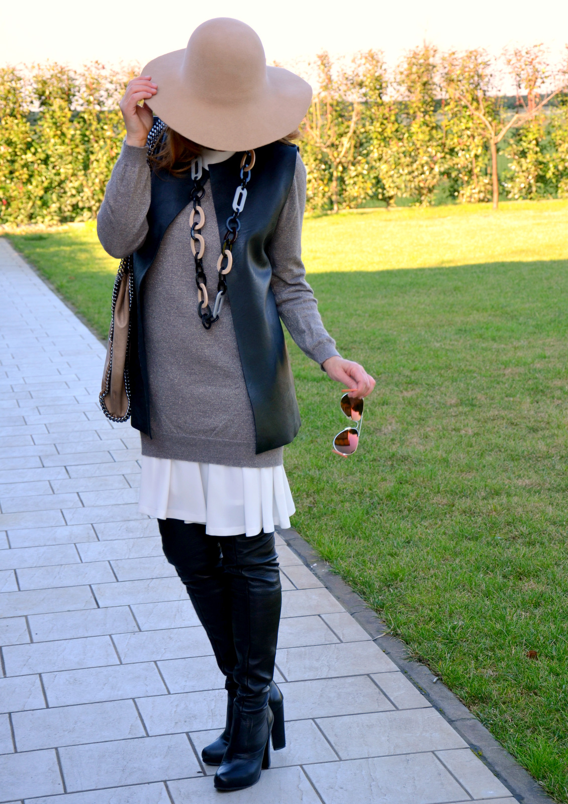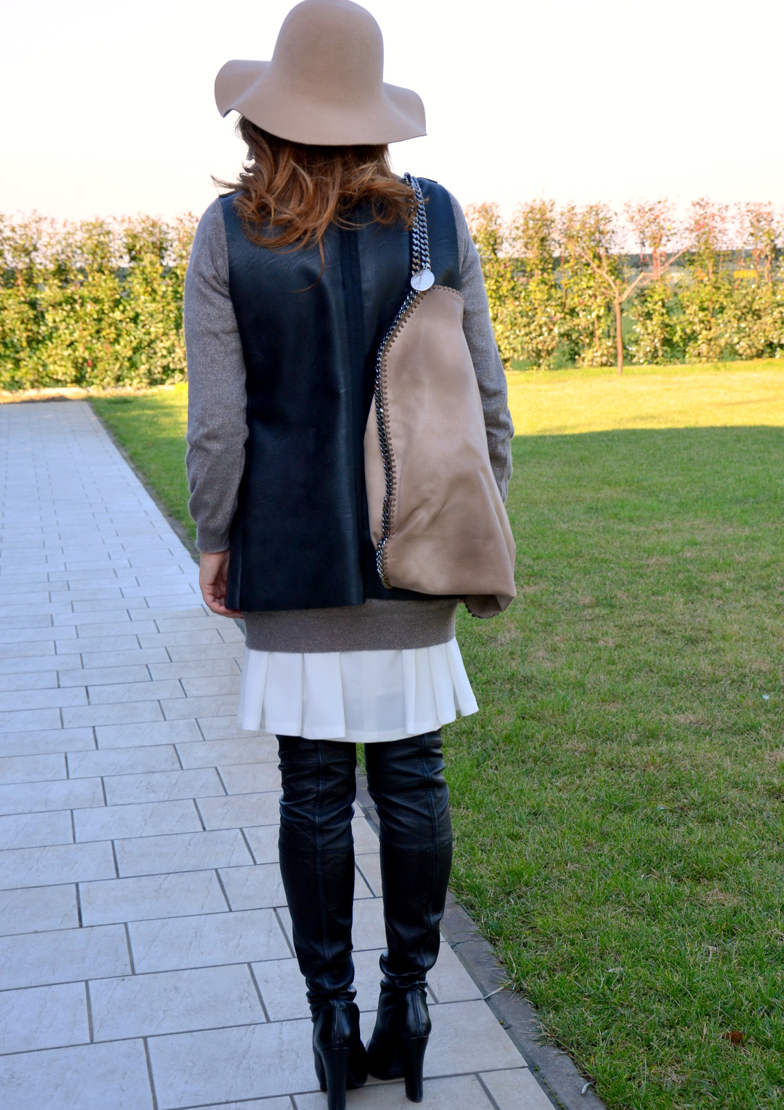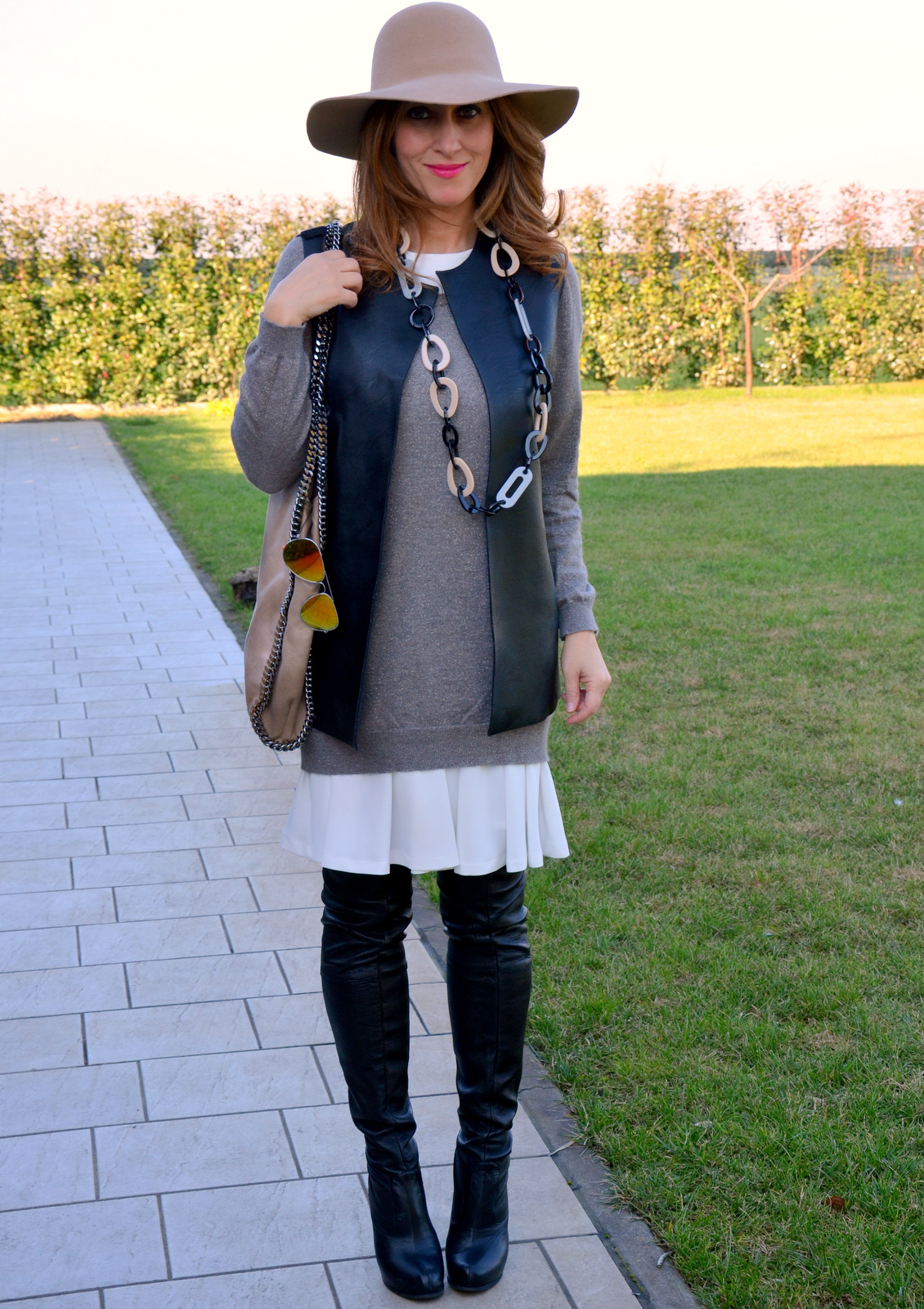 Oggi è la volta di un abito bianco leggero, (visto QUI) in forma pulita e fluida e che in questo outfit supera la stagionalità primaverile poiché è sottomesso ad un maglione cremoso, con pezzetti di lurex. Poiché non sopporto la lana a diretto contatto con la pelle, questa leggera overseason, quasi impalpabile, mi permette di giocare con una sovrapposizione dai colori minimal e dalle forme armoniose. Ho aggiunto una giacca smanicata in ecopelle e un paio di cuissarde, per un minimalismo dai colori basici e freschi.
