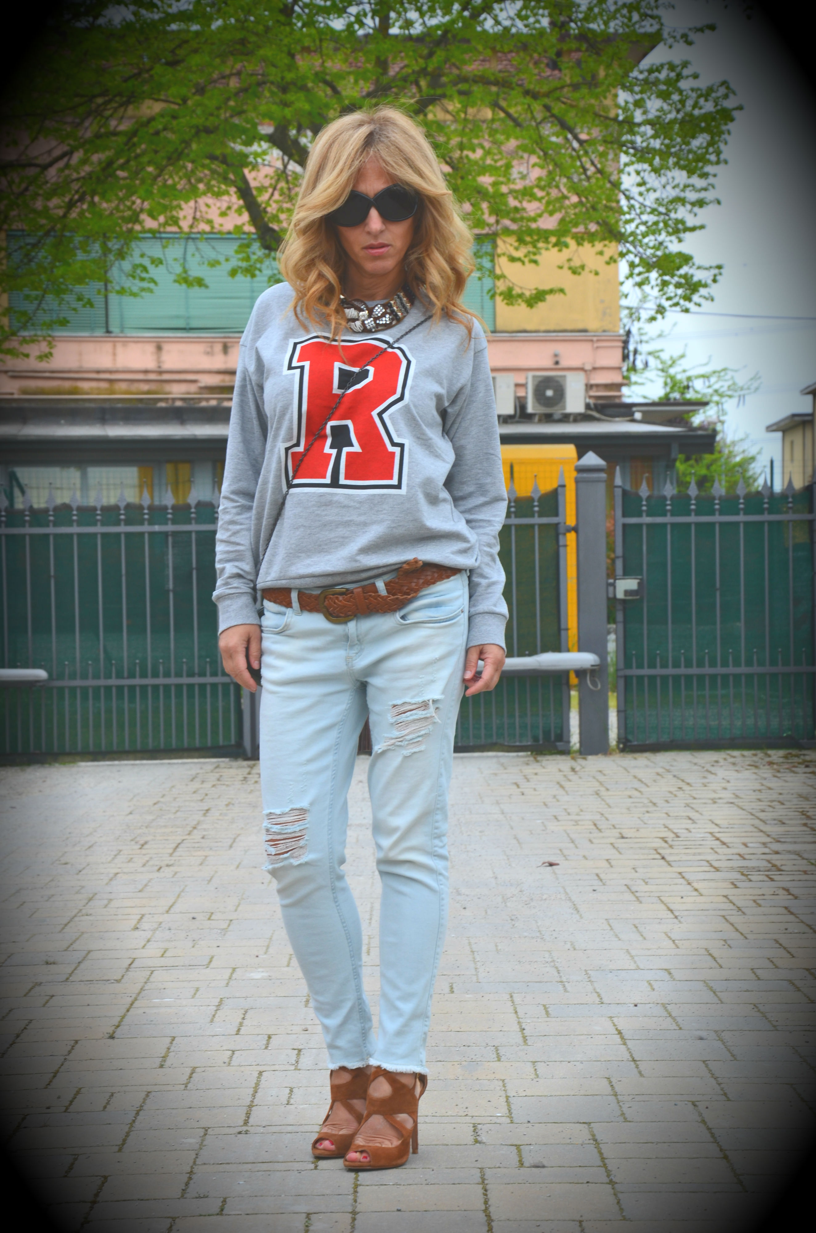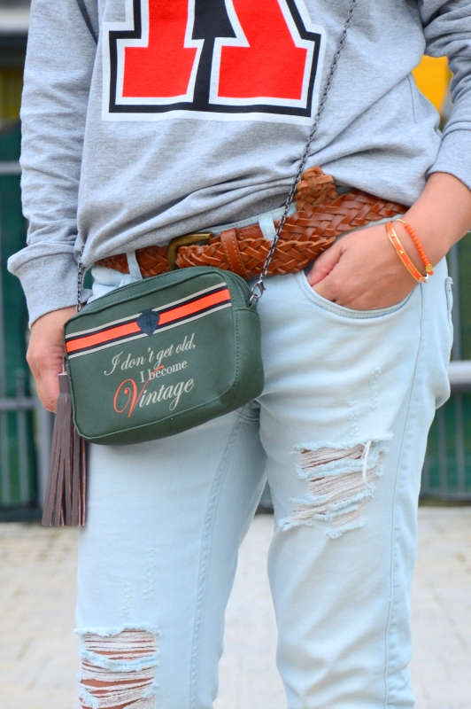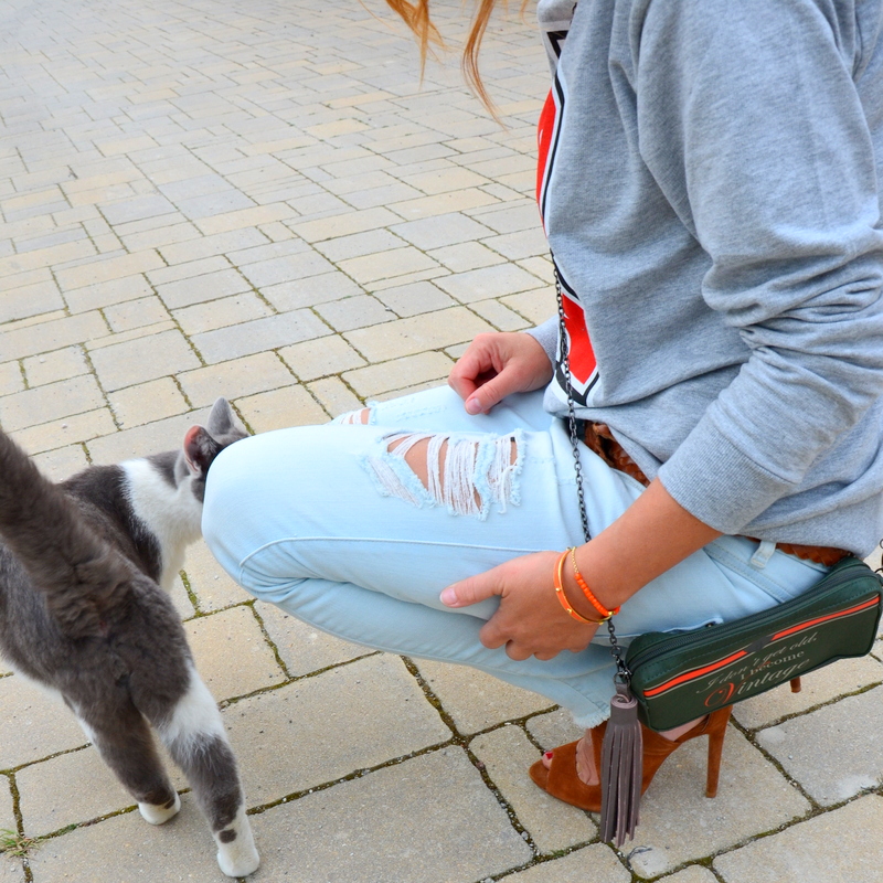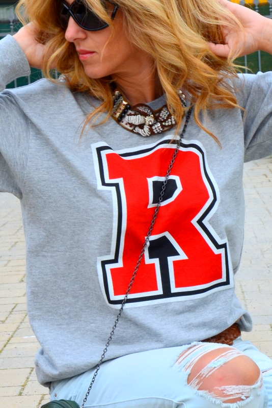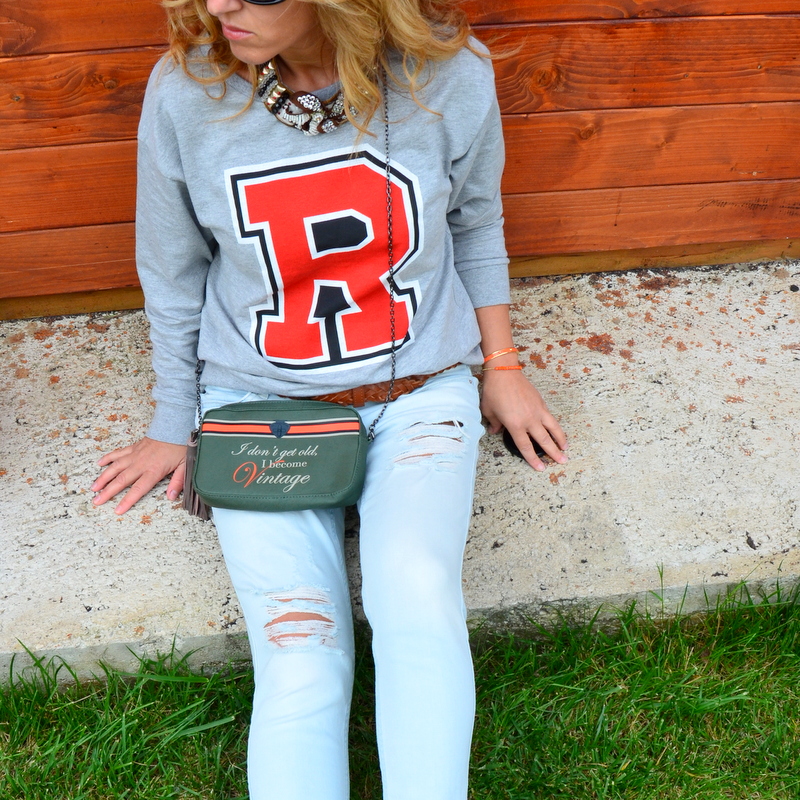 Sta felpa con la R mi ha fatto venire in mente un film con Bruce Willis sui servizi segreti e allora ho pensato di trasformare gli agenti in blogger 40enni intelligenti, brillanti e irresistibili! Non sono proprio anonima con una R rossa stampata, un denim strappatissimo, un tacco 12 e con un orange bracelet che in realtà sono armi segrete. La citazione sulla borsetta chiuderebbe a pennello il film tra i titoli di coda. Se qualcuno volesse pensare ad una sceneggiatura vi presterei volentieri il mio gatto per fare la “chat fatal” in tacchi e mitra!