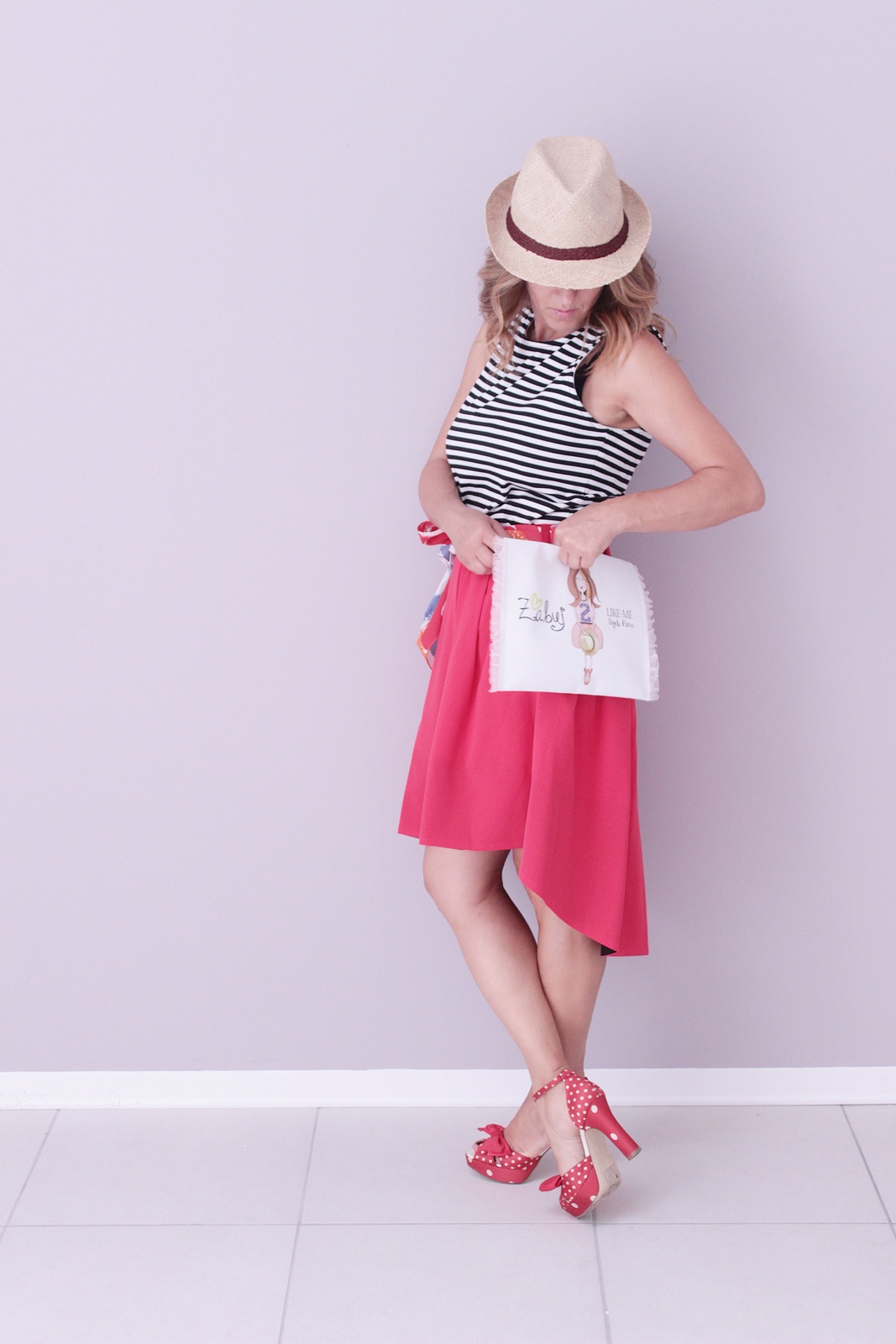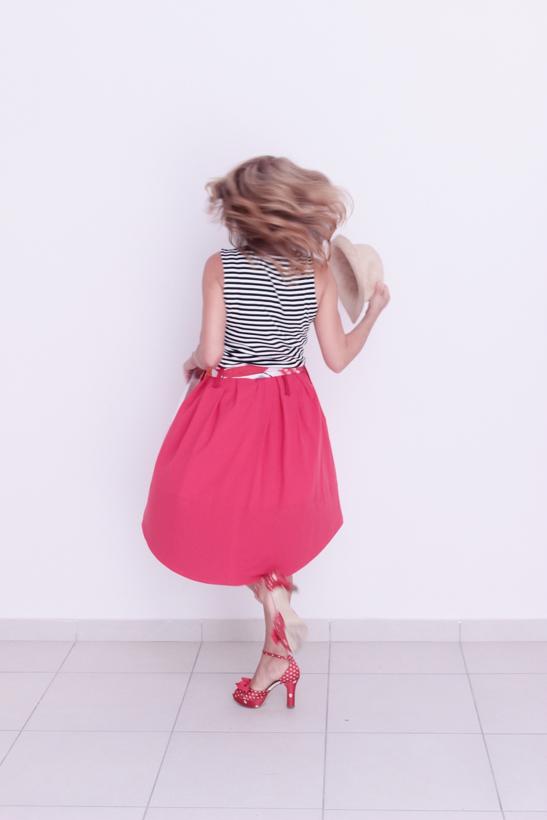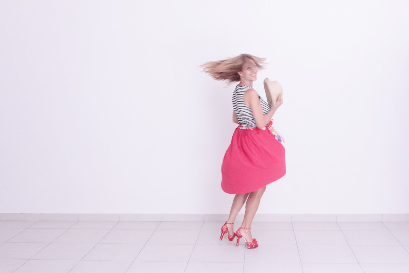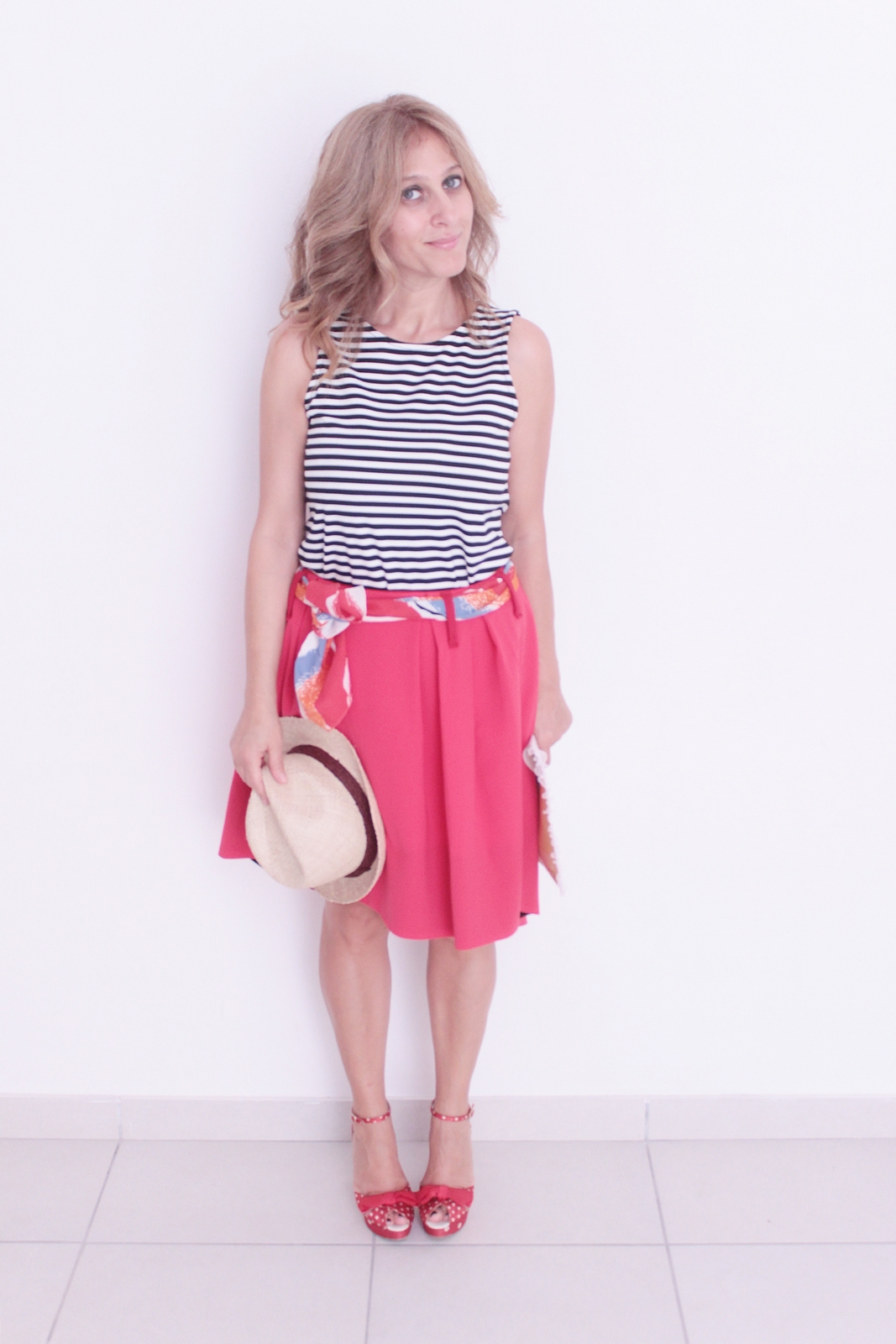 Gonna ampia, rossa, dal taglio asimettrico che cade piû lunga dietro lasciando intravedere l’interno nero per un bicolor audace. La canotta a righe mariniere che, abbinata al rosso, mi è sempre piaciuta, sdrammatizza e rende il look divertente ed estivo. Il cappello, guai se mancasse, piuttosto non vi rivolgo la parola. In estate e in inverno voglio fare la misteriosa e la maliziosa. Tacchi bon ton, visti già 350 mila volte, e scusate a volte mi abbono inconsapevolmente e mi capita spesso, poichè ho talmente tante, troppe scarpe che mi stanco di cercare. Foulard, annodato in vita, a simulare una cintura, dall’allure parigino ed ogni tanto ci sta che ci facciamo ispirare dalle nostre cugine d’oltralpe, se non altro perché noi, i foulard non li sfruttiamo abbastanza.