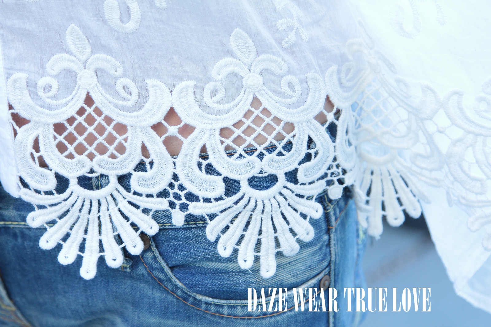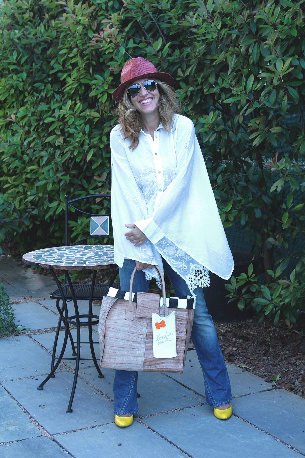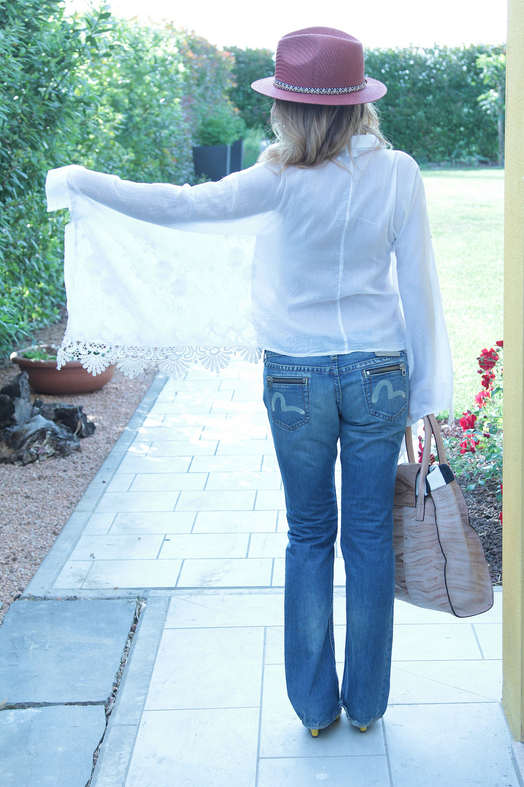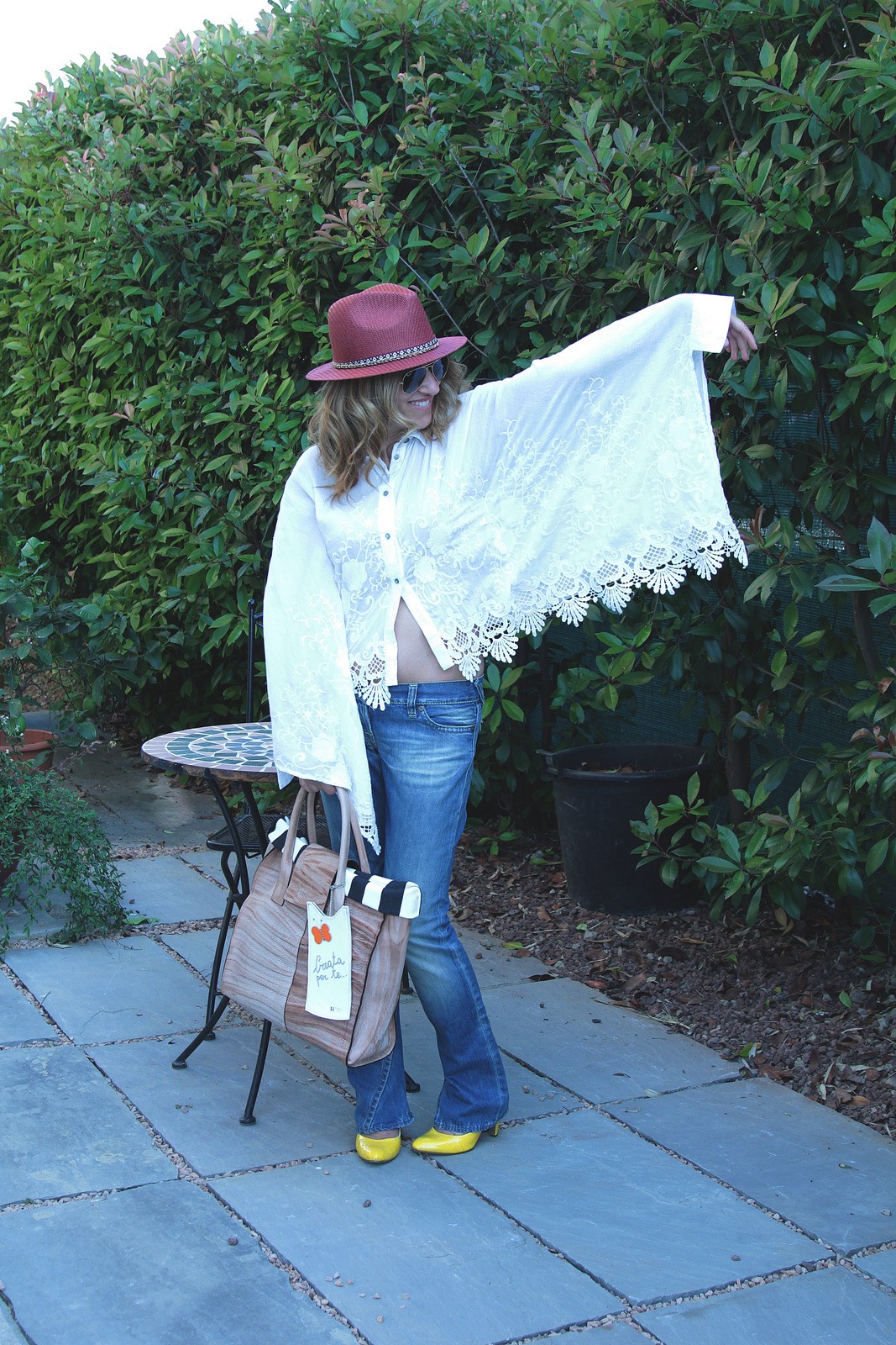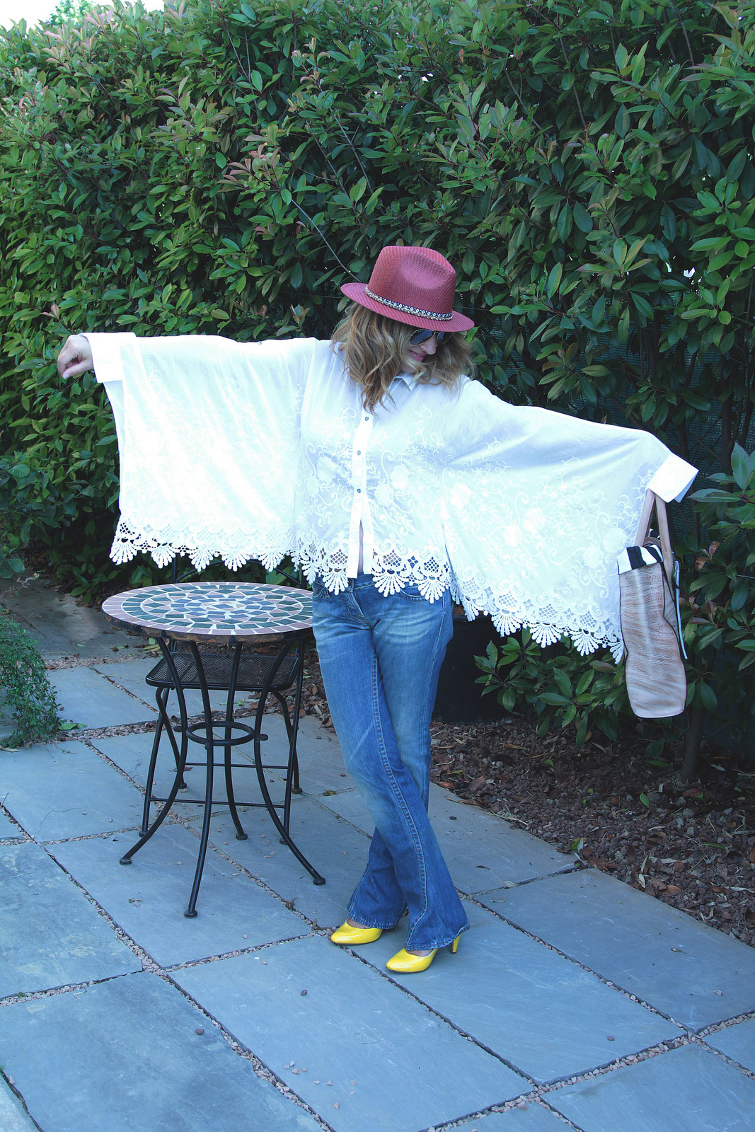 Io oggi ho scelto una fusion di energia, vintage, morbidezza, coccole e libertà per un look dai volumi leggeri, con ali e bordature di una camicia bianca in pizzo sangallo di Daze Wear SS 2015, un denim a palazzo, un panama e tocchi di giallo intenso ambientati nel mio giardino. Un mix tra lo stile easy degli anni ’70 sbilanciato dal tocco moderno del decoltè giallo.