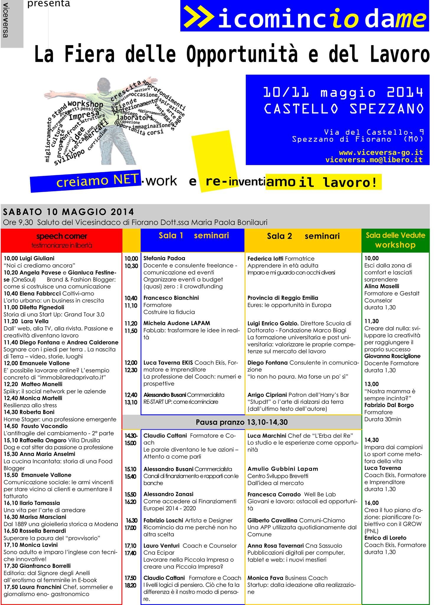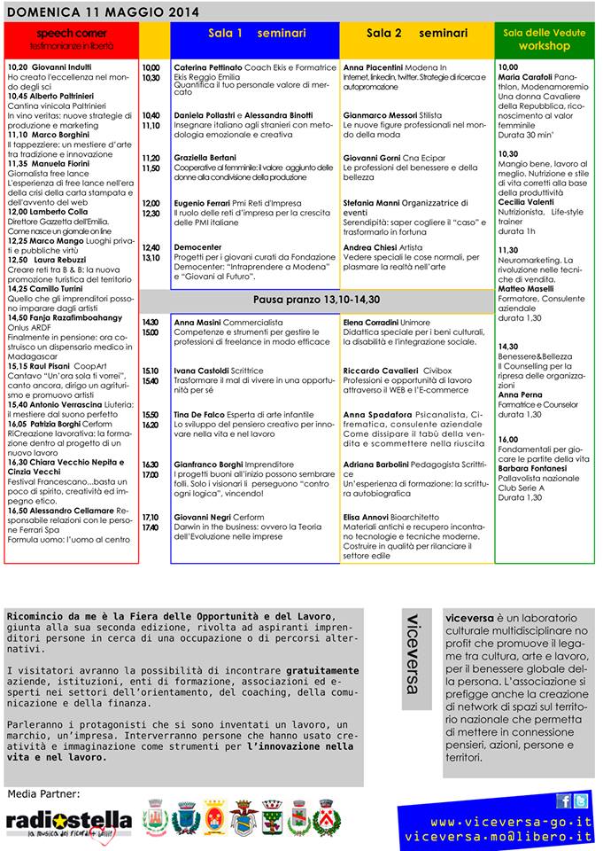 La prossima edizione avrà luogo il 10/5/2014 al Castello di Spezzano (Mo). Durante la fiera i visitatori avranno la possibilità di incontrare aziende, istituzioni, enti di formazione, associazioni ed esperti nei settori della comunicazione, finanza, orientamento e professional coach. All’interno della fiera saranno proposti seminari, workshop e conferenze.