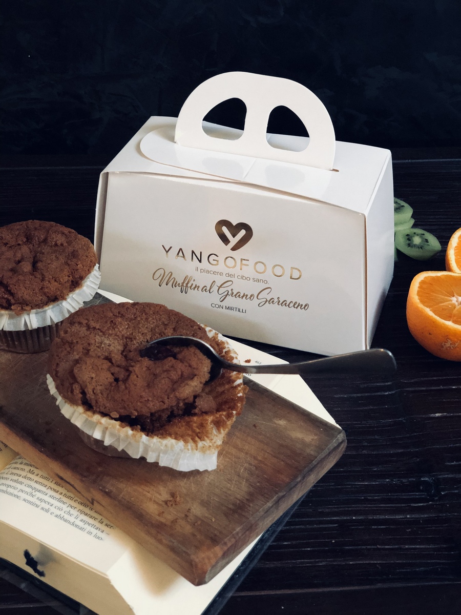 Continuo? Si, certo Vorrei farvi conoscere il Muffin di grano saraceno al mirtillo rosso! Arrivano in coppia. Eleganti, maestosi, l’uno dall’altro. Si presentano ai miei occhi sgranati, in una confezione bianca richiudibile, poiché sono davvero appena sfornati per me e infatti il messaggio è chiaro: tenerli in frigo e consumarli in qualche giorno.