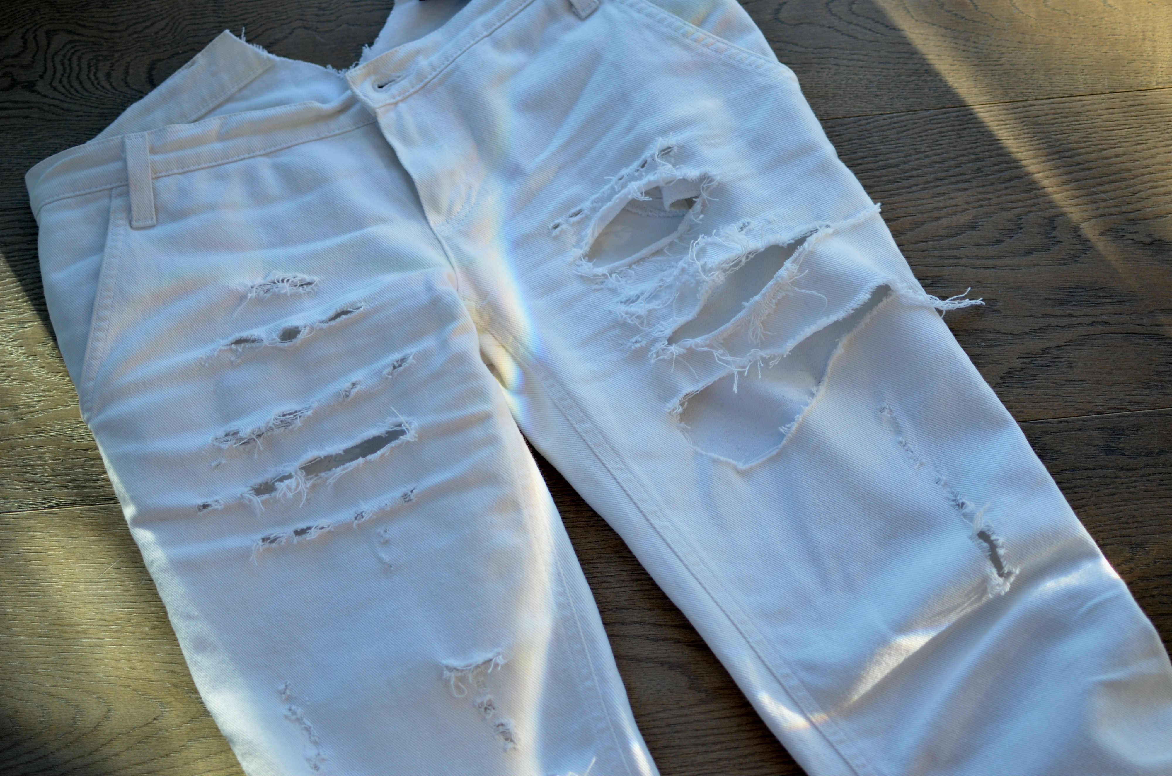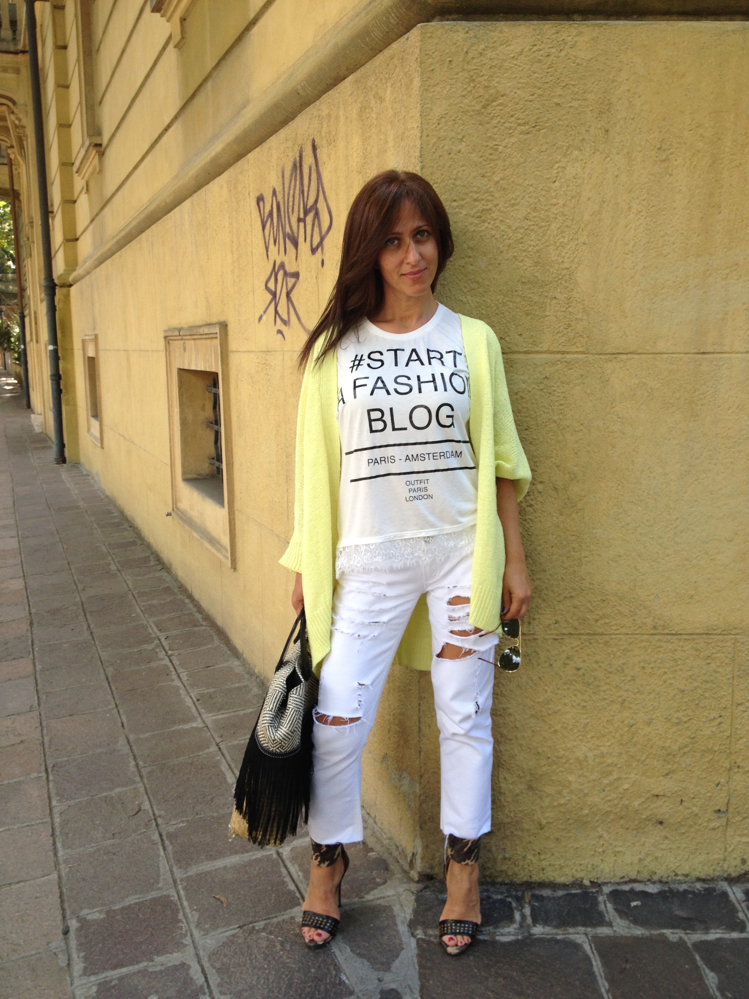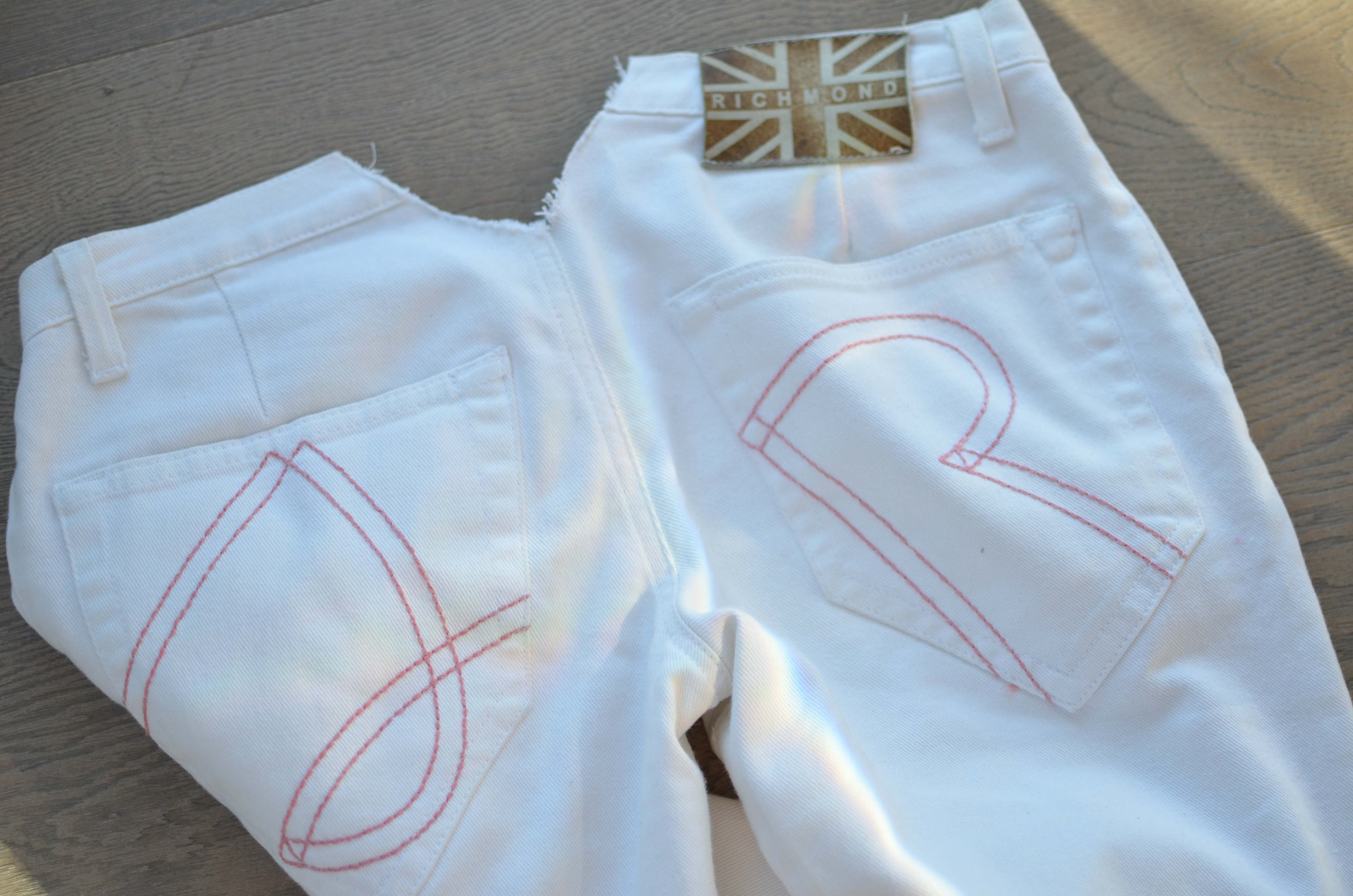 Il mio outfit? Avevo un denim bianco di Richmond di circa 10 anni fa indossato forse due volte. Mi piaceva talmente poco che non mi spiego il motivo di quell’acquisto. Finalmente nel 2014 riesco a capire come modificarlo…con un paio di tagli vivi fatti ovunque e a caso. Vi piace?