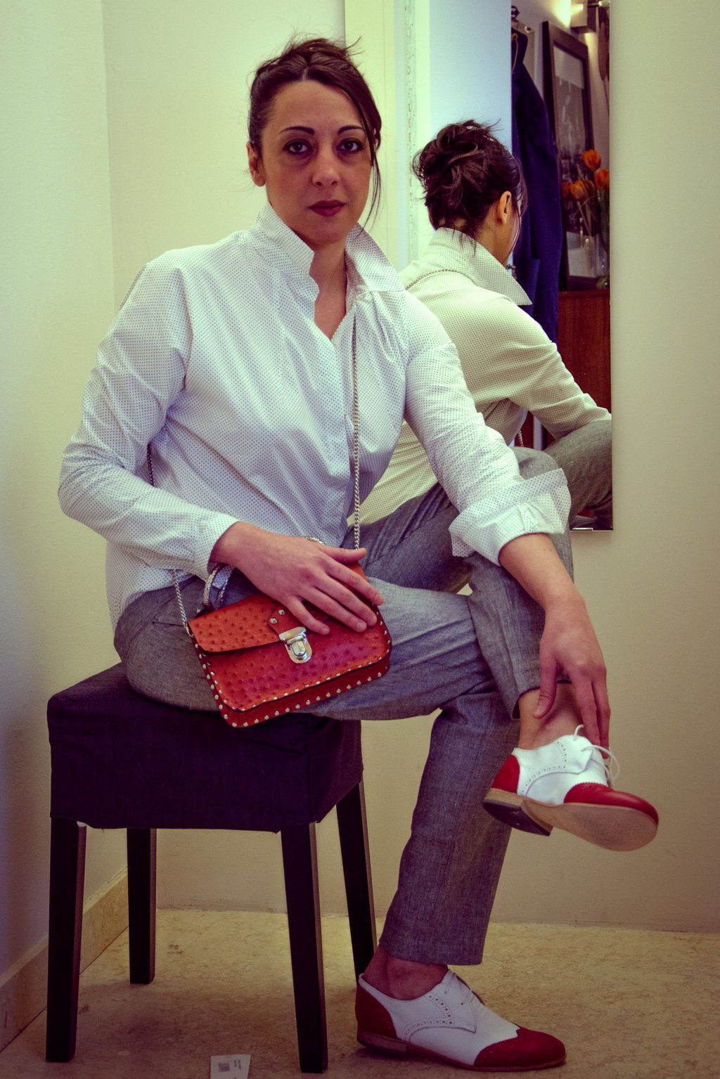 Margaret indossa pantalone uomo Crossley, Camicia Bianca a pois Sartoria, Cravatta in seta, Scarpa stringata bicolor Redstone di San Pietro, 9 (Formigine)