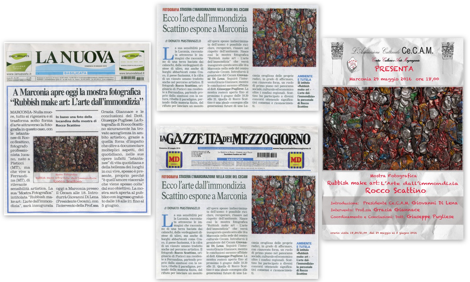 Finalmente questo lungo ponte di avvicina. Per chi è in viaggio verso il sud dell’Italia vi segnalo questo importante appuntamento ancora fino al 5 giugno, una mostra da titolo: Rubbish Make art l’arte dall’immondizia, di Rocco Scattino. Esattamente a Marconia, una ridente cittadina in provincia di Matera, all’interno dell’associazione culturale Ce.C.A.M.