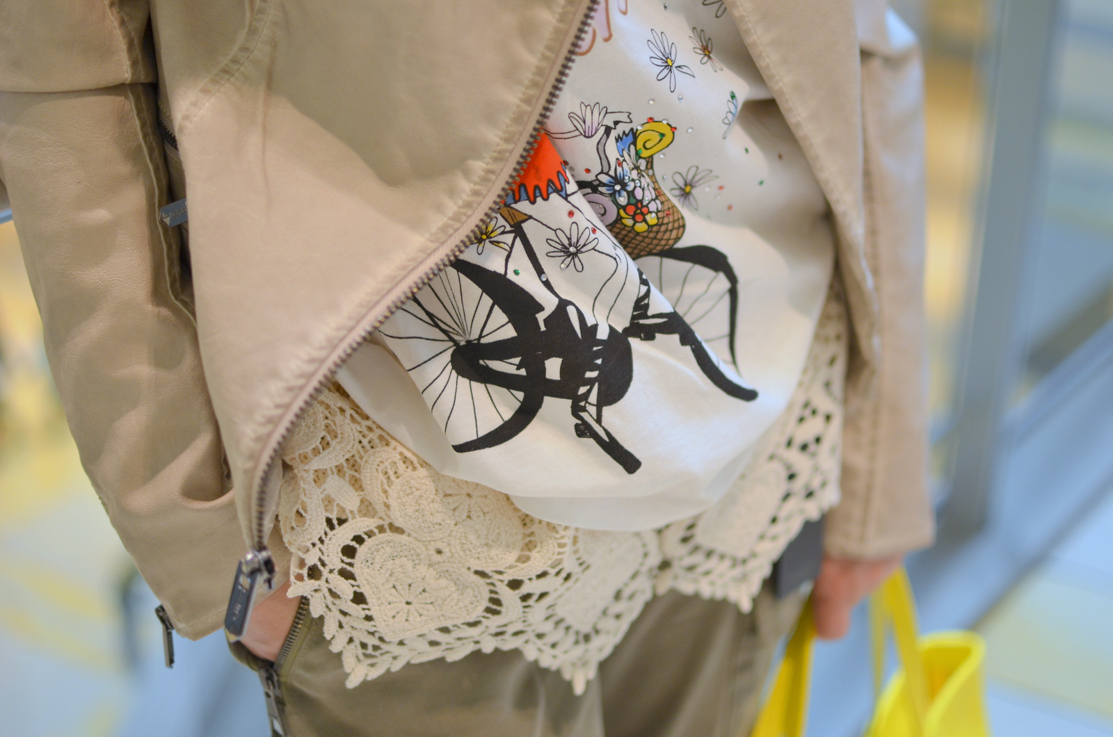Oggi vi propongo un outift realizzato durante il mio shopping day nei negozi Pellizzari di Roma Bufalotta nel centro commerciale Porta di Roma in Marzo. Un outfit che si caratterizza per le sovrapposizioni: strati di simpatiche t shirts leggere, canotta in pizzo color crema su pantaloni cargo army chic e un giubbetto beige.