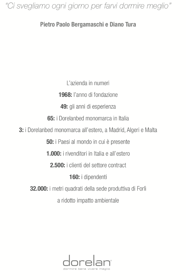 Straordinaria serenità, perfetto equilibrio tra azienda, interessi economici e sociali. Dorelan, marchio di B&T spa, azienda orgoglio italiano tra le più importanti nella produzioni di letti e materassi, sommier e guanciali, complementi d’arredo, fino all’intera stanza da letto e tutto ciò che concilia il buon sonno.