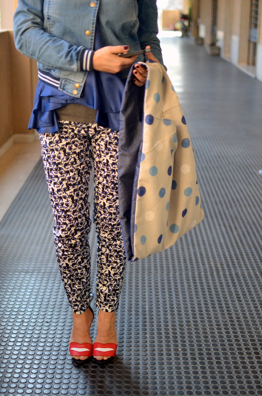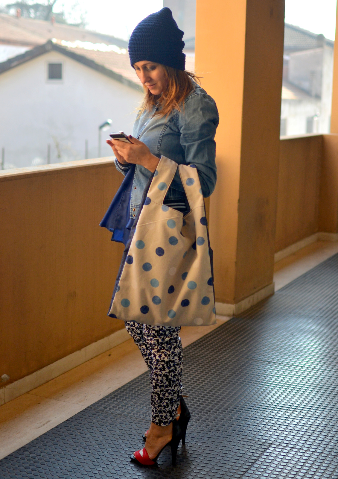 Shopping day, shopping look. Occhi puntati su una maxi shopper a pois a ruota libera per divertirsi con gli accessori. Tessuto ecopelle e canvas per una borsa busta super capiente e funzionale, pensata, disegnata e prodotta in italia al 100%.
