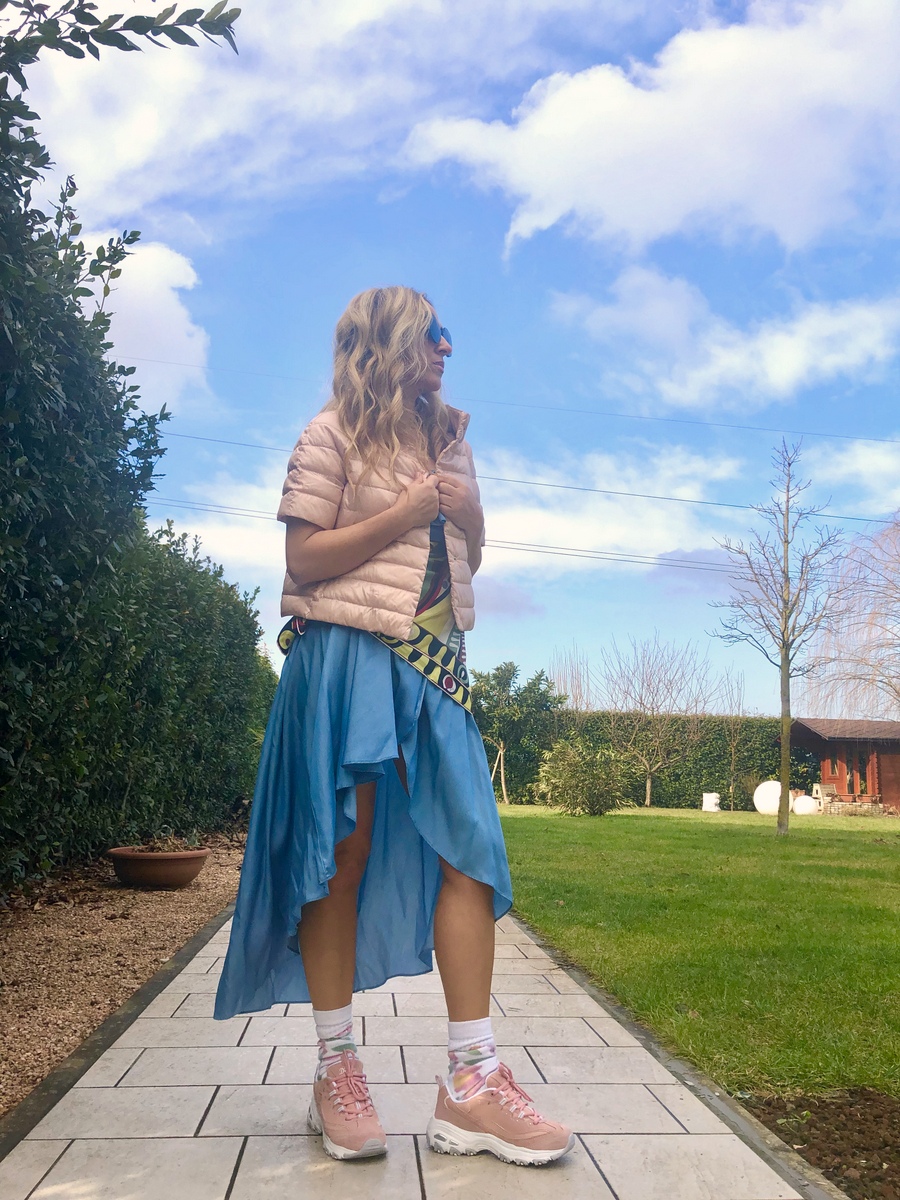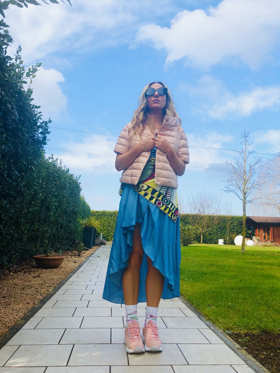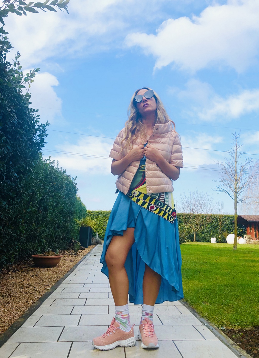 Per il momento mi fermo qui. Intanto il mio look di oggi è davvero una sperimentazione. Volevo valorizzare le mie nuove sneakers #Skechers rosa (che potete trovare on line su QVC), con un look di forte impatto. Una sovrapposizione di volant, di colori e di foulard. Leggerezza, freschezza, voglia di primavera, voglia di correre. Oggi c’erano 11 gradi. Un sole meraviglioso ha illuminato e colorato questa giornata. Vibrazioni intense di allegria e ironia nel mio mondo fashion!