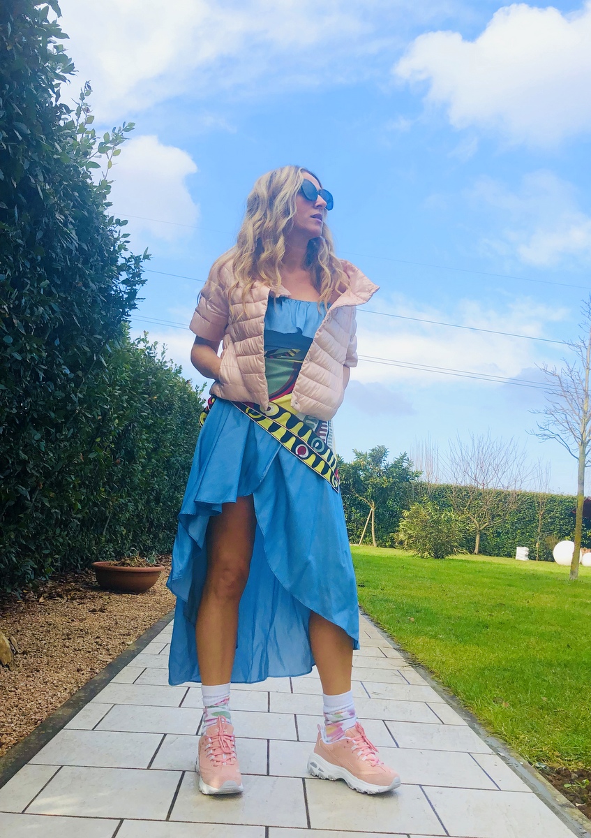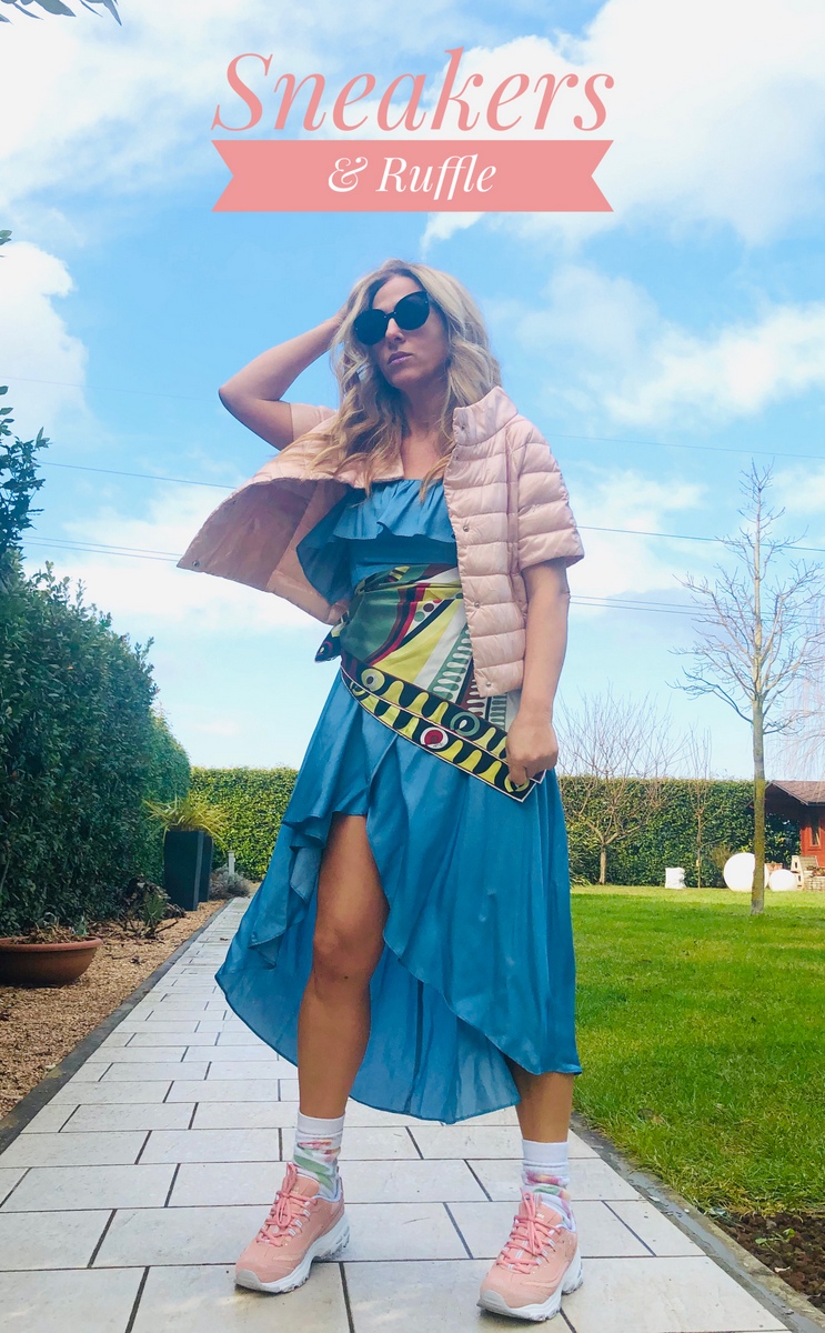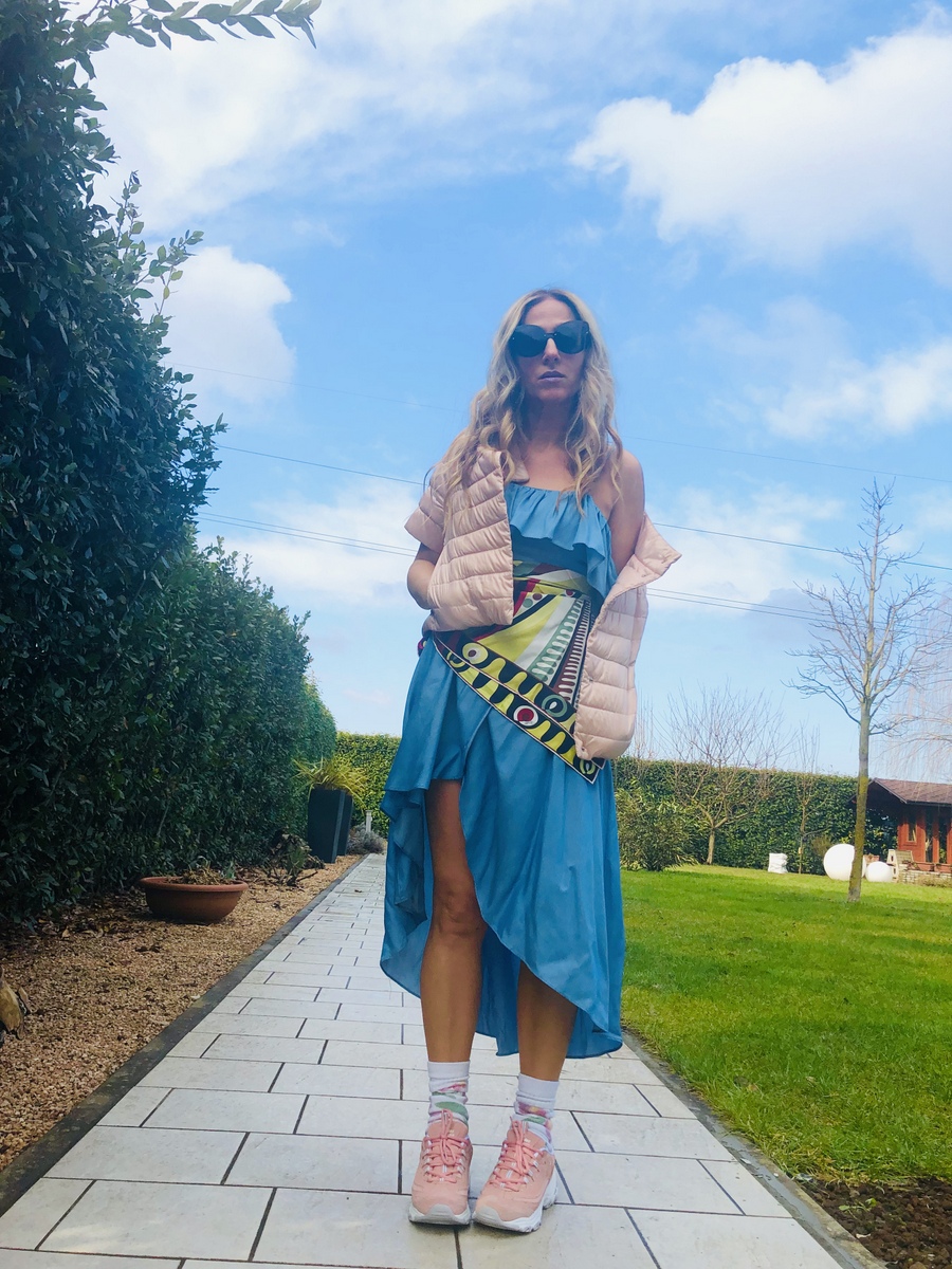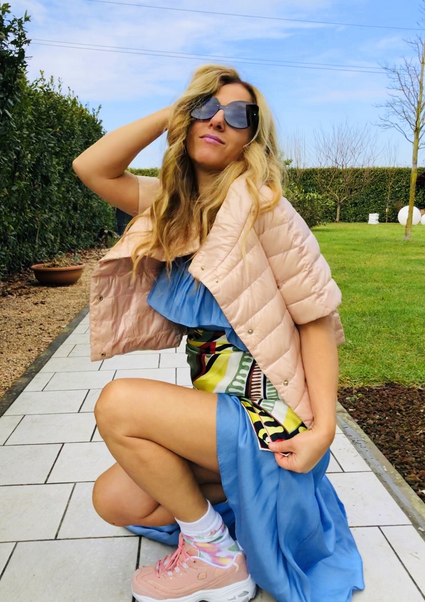 Per il momento mi fermo qui. Intanto il mio look di oggi è davvero una sperimentazione. Volevo valorizzare le mie nuove sneakers #Skechers rosa (che potete trovare on line su QVC), con un look di forte impatto. Una sovrapposizione di volant, di colori e di foulard. Leggerezza, freschezza, voglia di primavera, voglia di correre. Oggi c’erano 11 gradi. Un sole meraviglioso ha illuminato e colorato questa giornata. Vibrazioni intense di allegria e ironia nel mio mondo fashion!