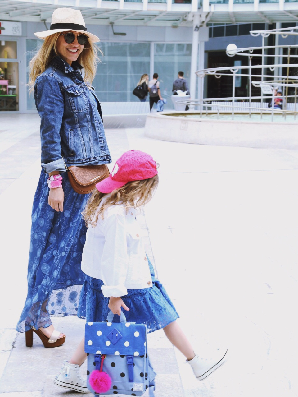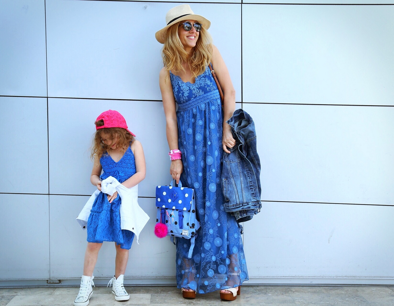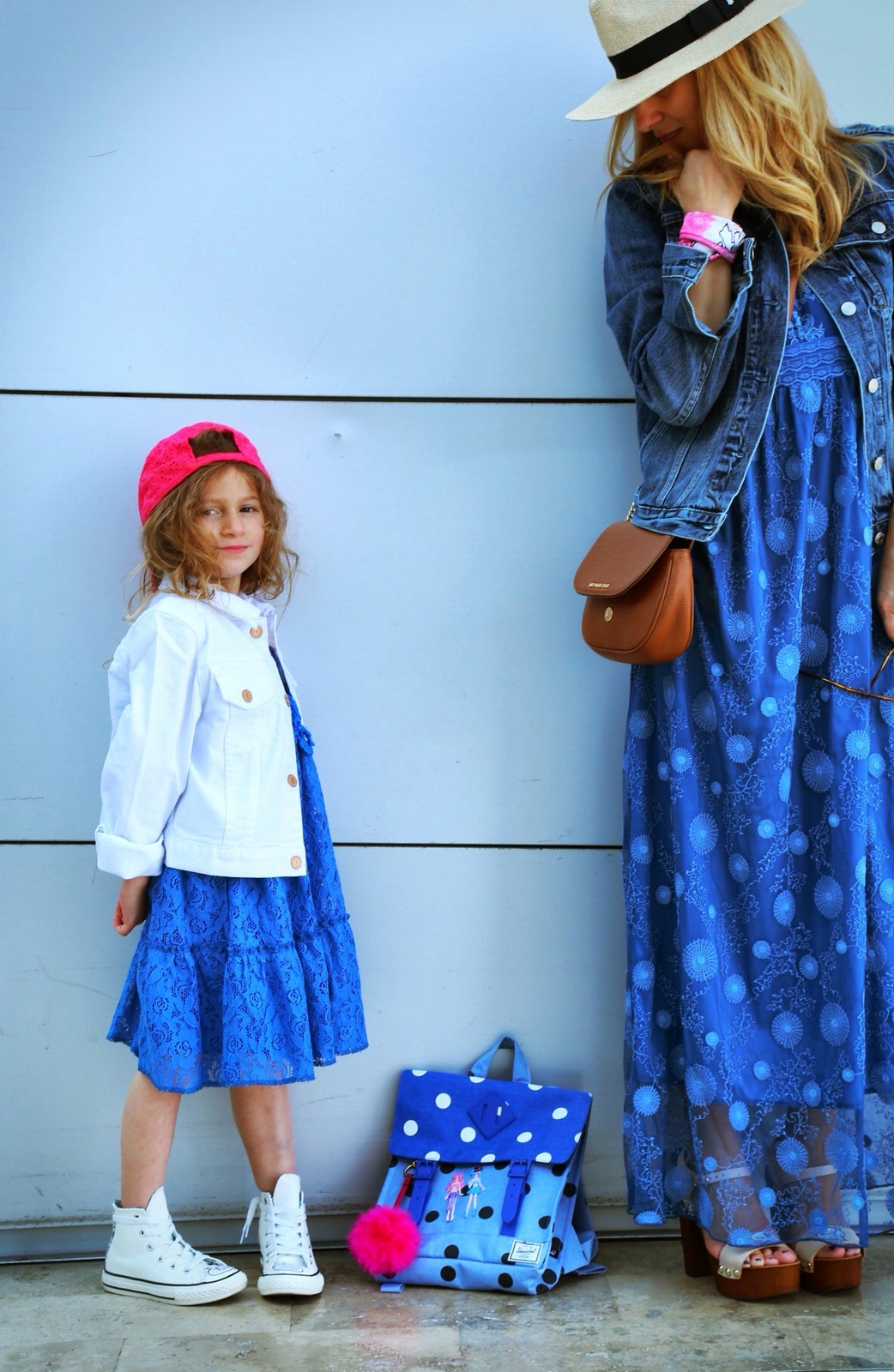 Io ho scelto la versione lunga e lei la versione mini. Difficile resistere alla tentazione di abbinarci una comodissima converse bianca alta della serie chuck taylor all star per lei e per me invece un comodissimo sandalo con il tacco in legno, di un rosa delicato di Maipiùsenza. Infine ci siamo super accessoriate con cappelli, occhiali, una meravigliosa e comoda tracollina di Michael Kors e uno zainetto a pois.