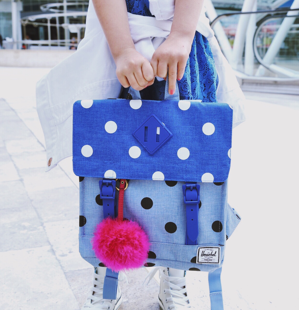 La Bibi ha riempito il suo zainetto di Herschel Survey con foglietti di tatuaggi e stickers e che in un momento di relax ha attaccato sulla patta della borsa blu con pois bianchi e neri e sui miei sandali.