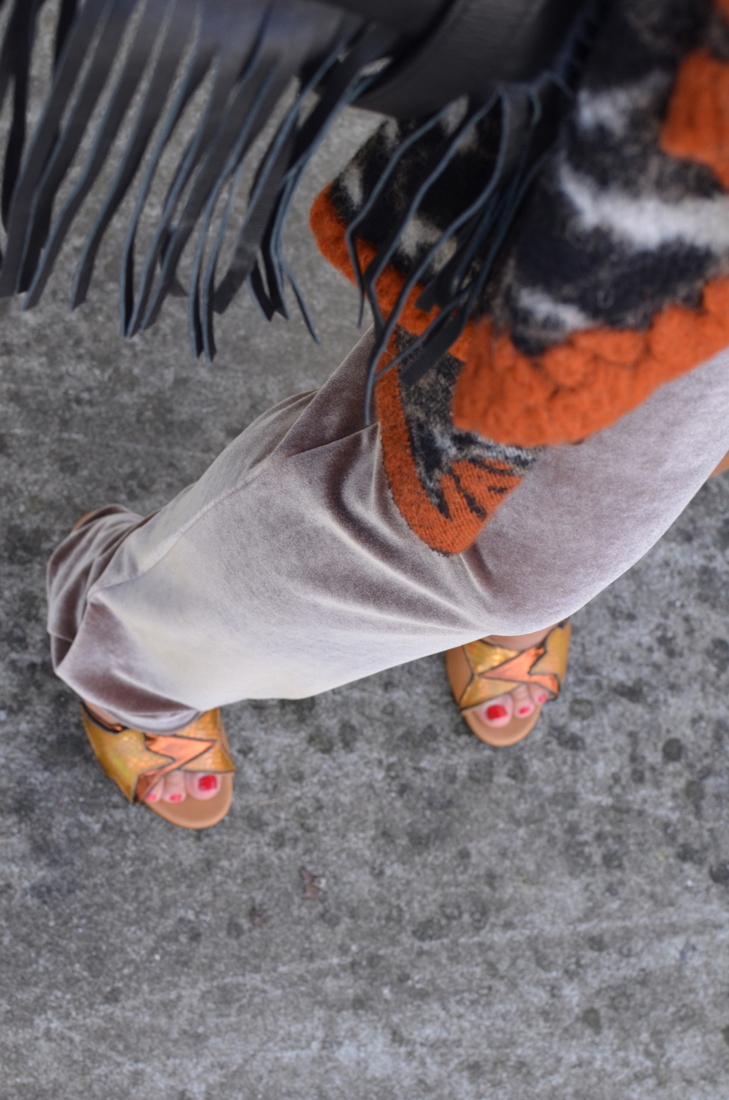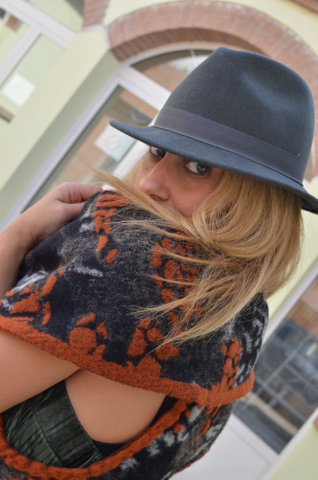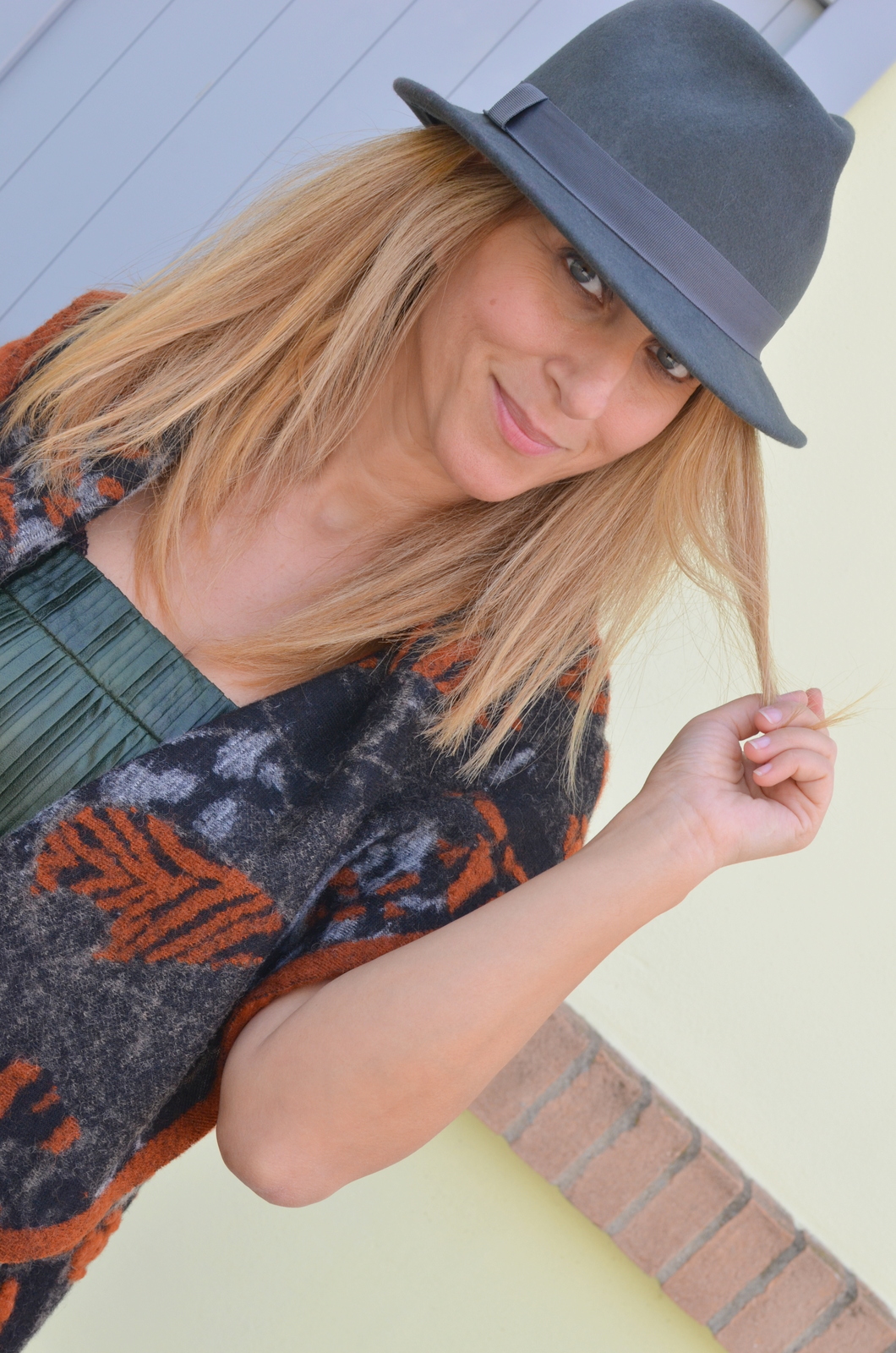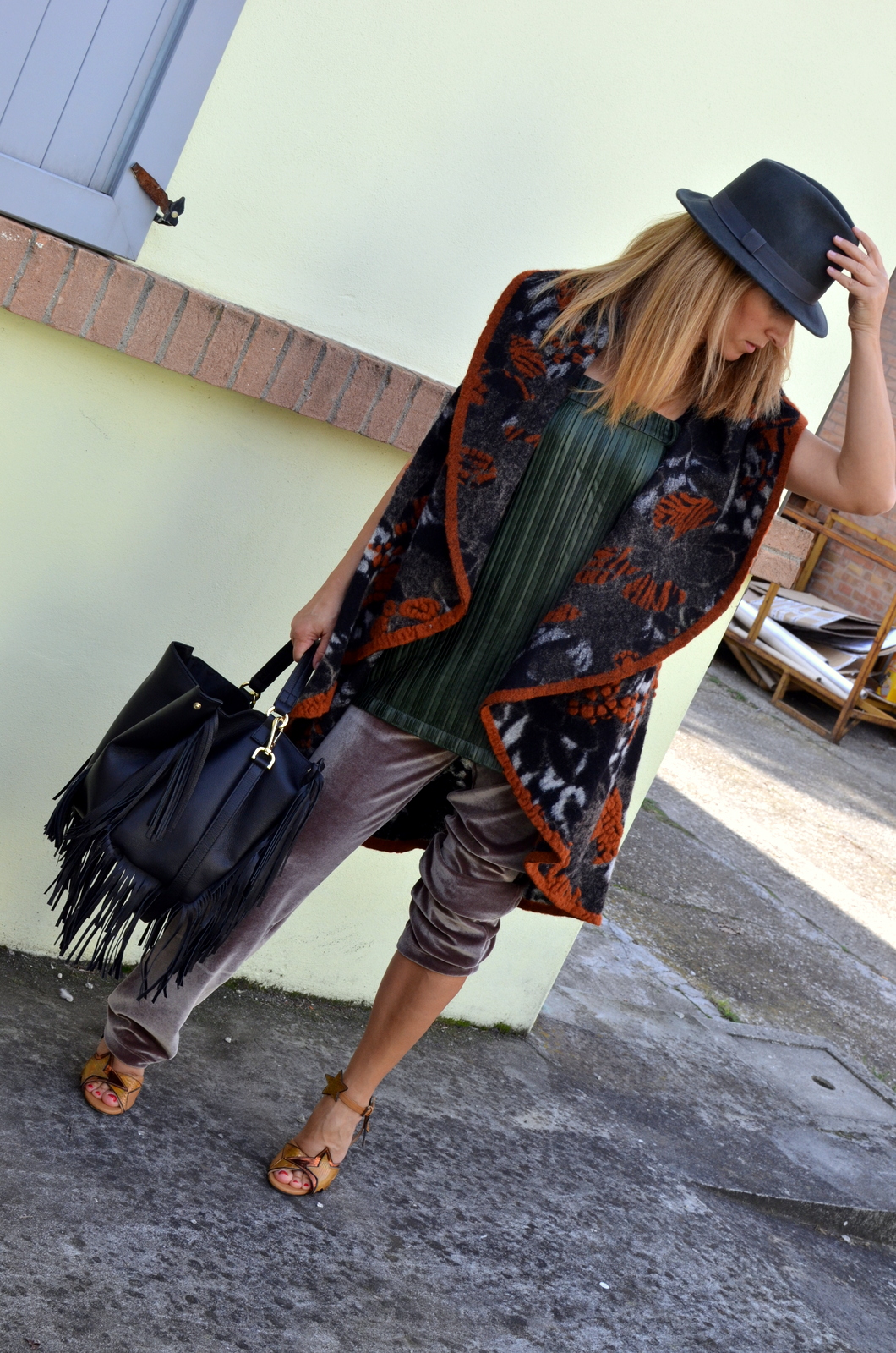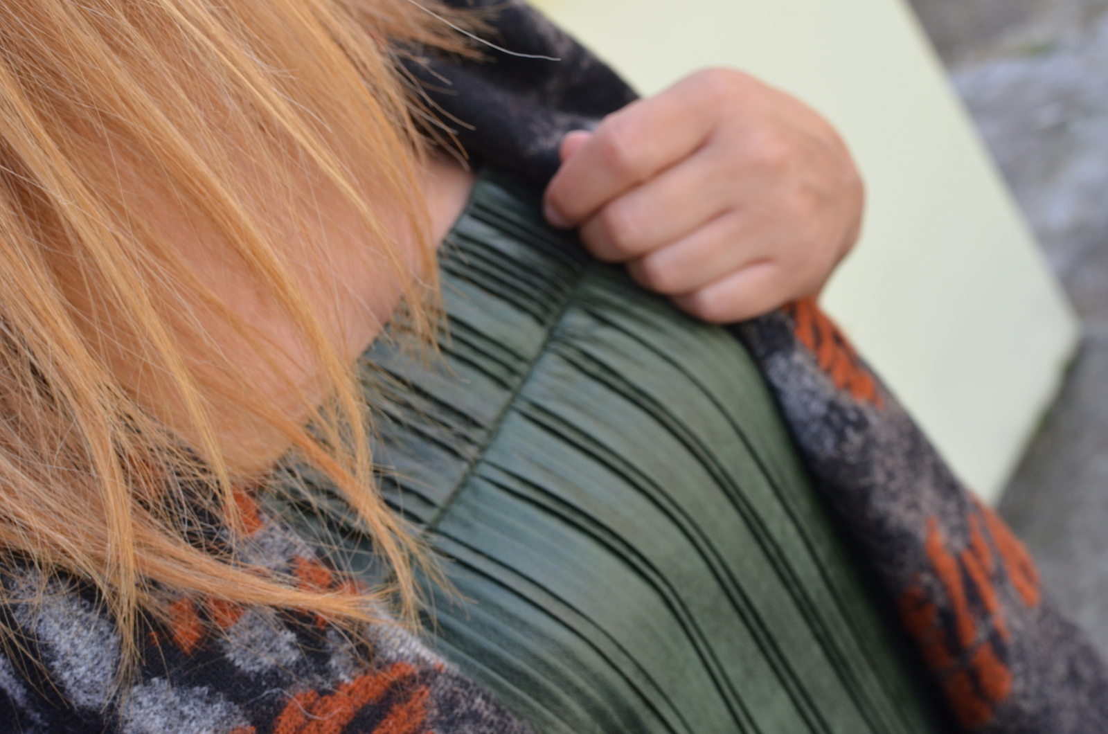 Pantalone stile jogging, modello palazzo in velluto (che avete già visto QUI in versione autumn beach), un top plissettato in ecopelle che in realtà è una pencil skirt  traformata in top. Un bel verde bottiglia con sovrapposto un gilet maxi cardigan dalla miscela di colori esplosivi.