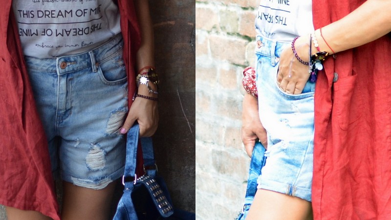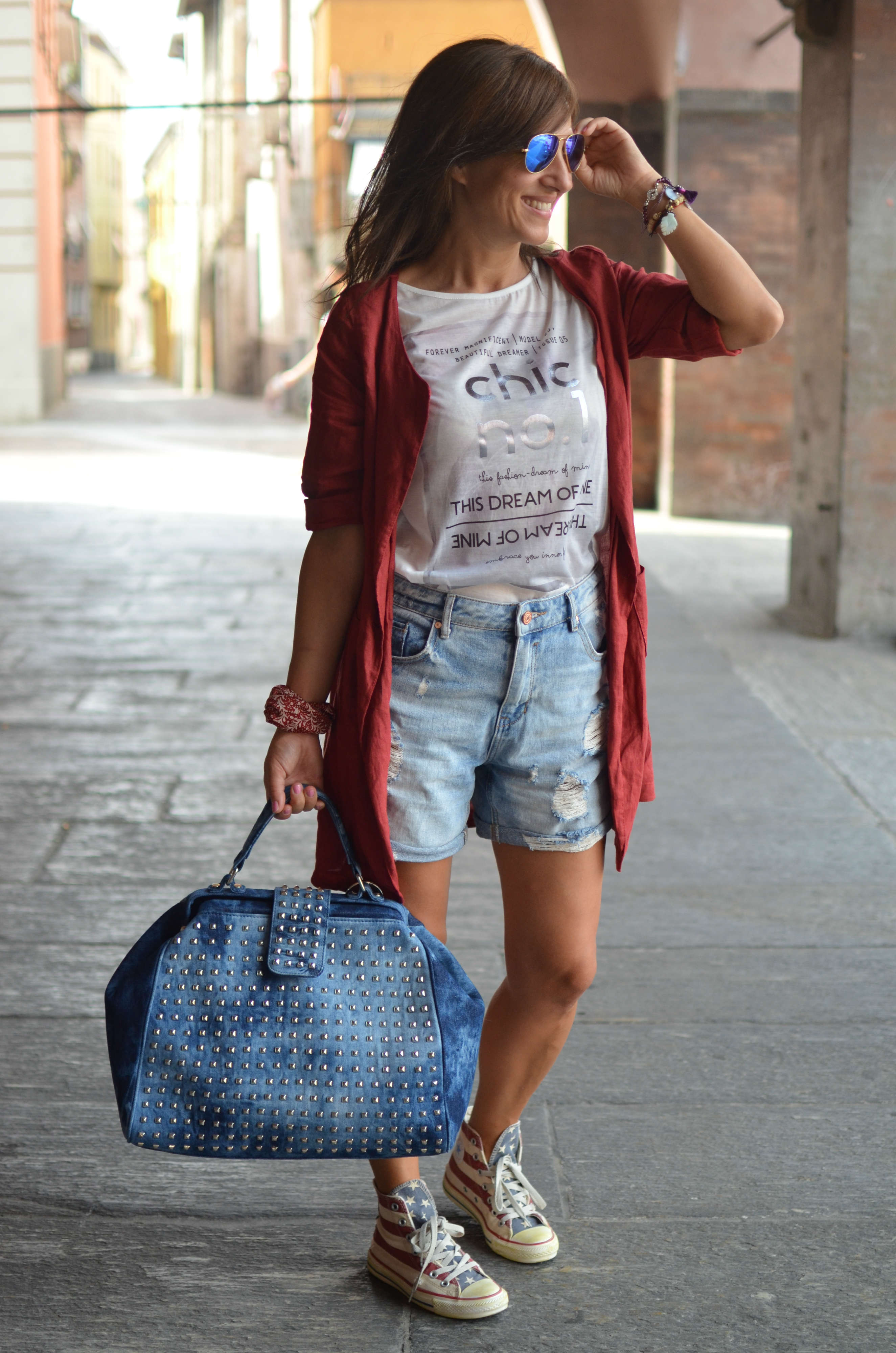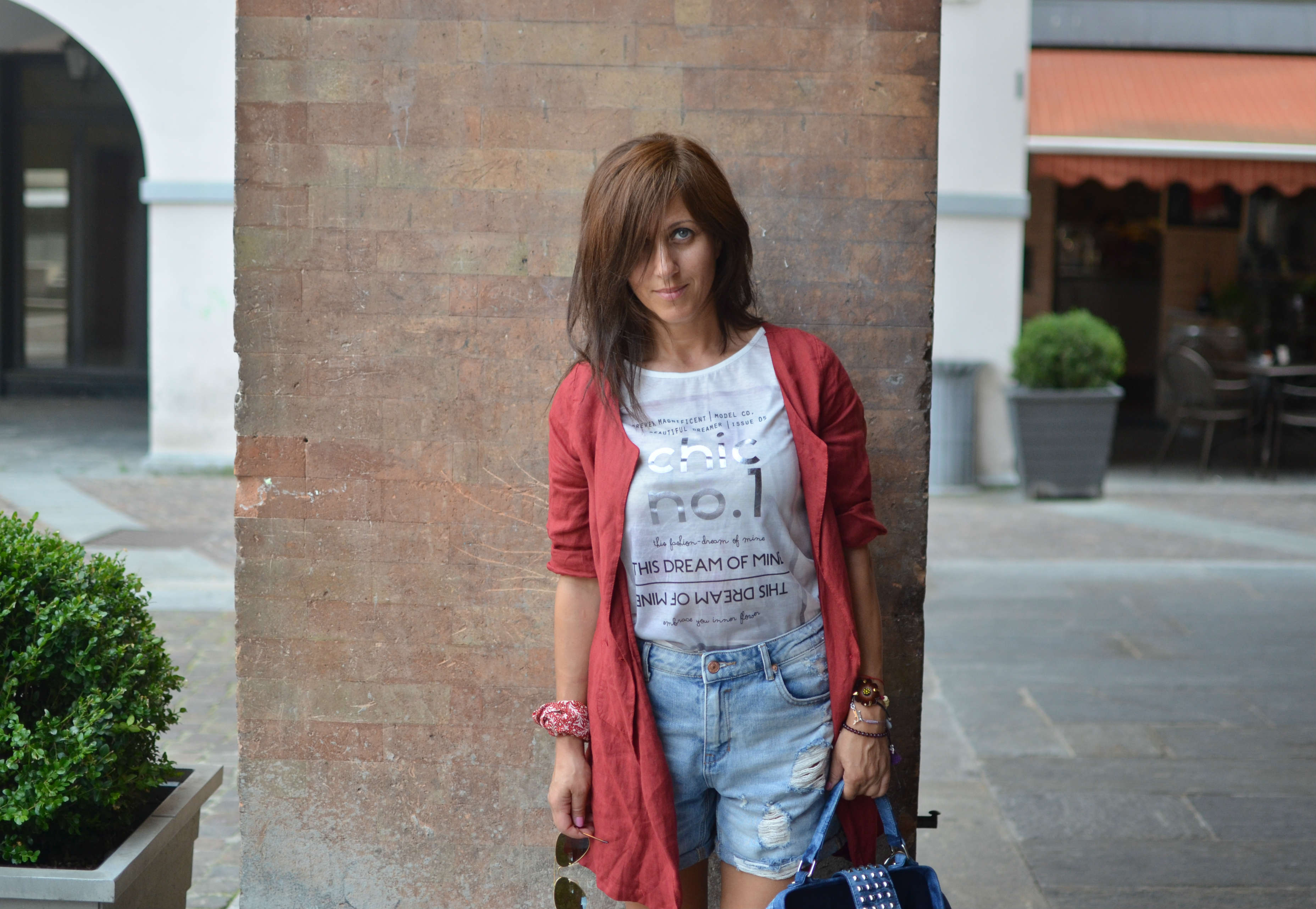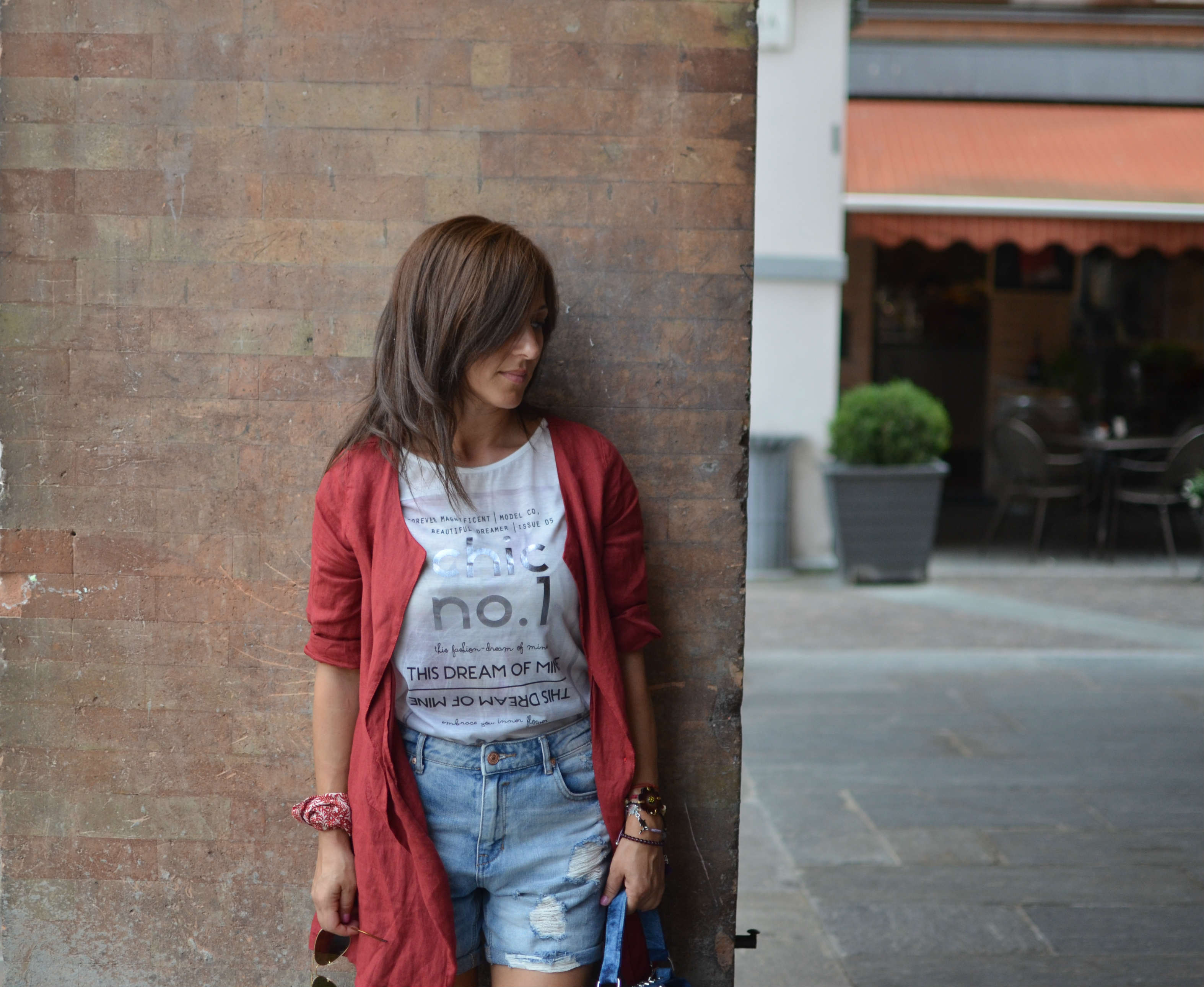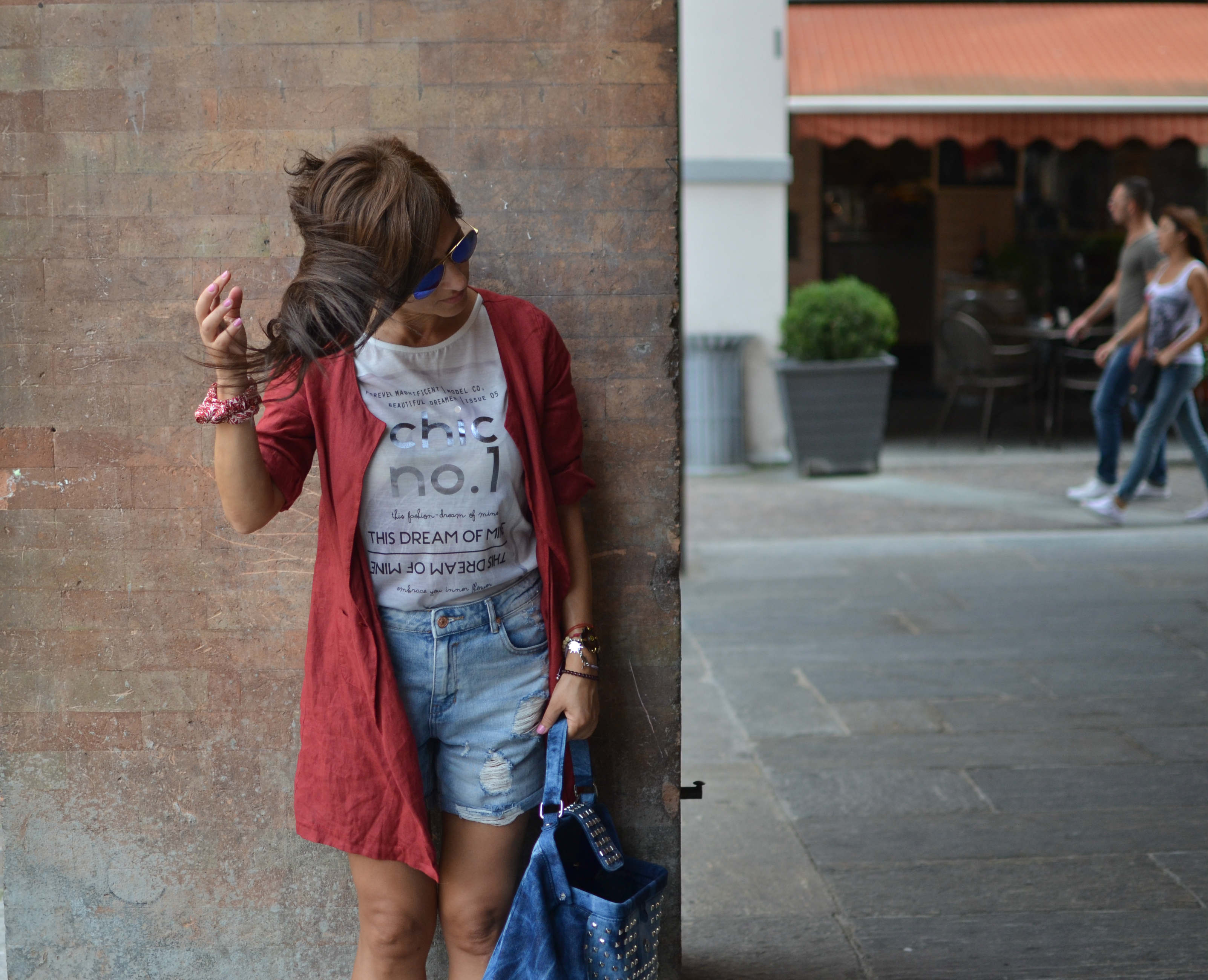 Il mio paio di short denim a vita alta rubati dall’armadio degli anni ’80, versatili, cool e soprattutto casual. Una tshirt infilata nei pantaloni accompagnato da uno spolverino in lino color porpora rigorosamente stropicciato.