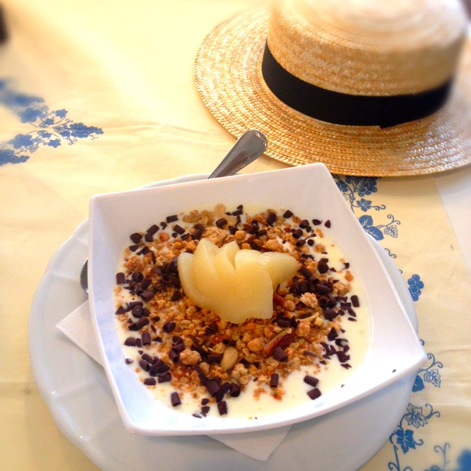 Yogurt con cereali e scaglie di cioccolato e pere!