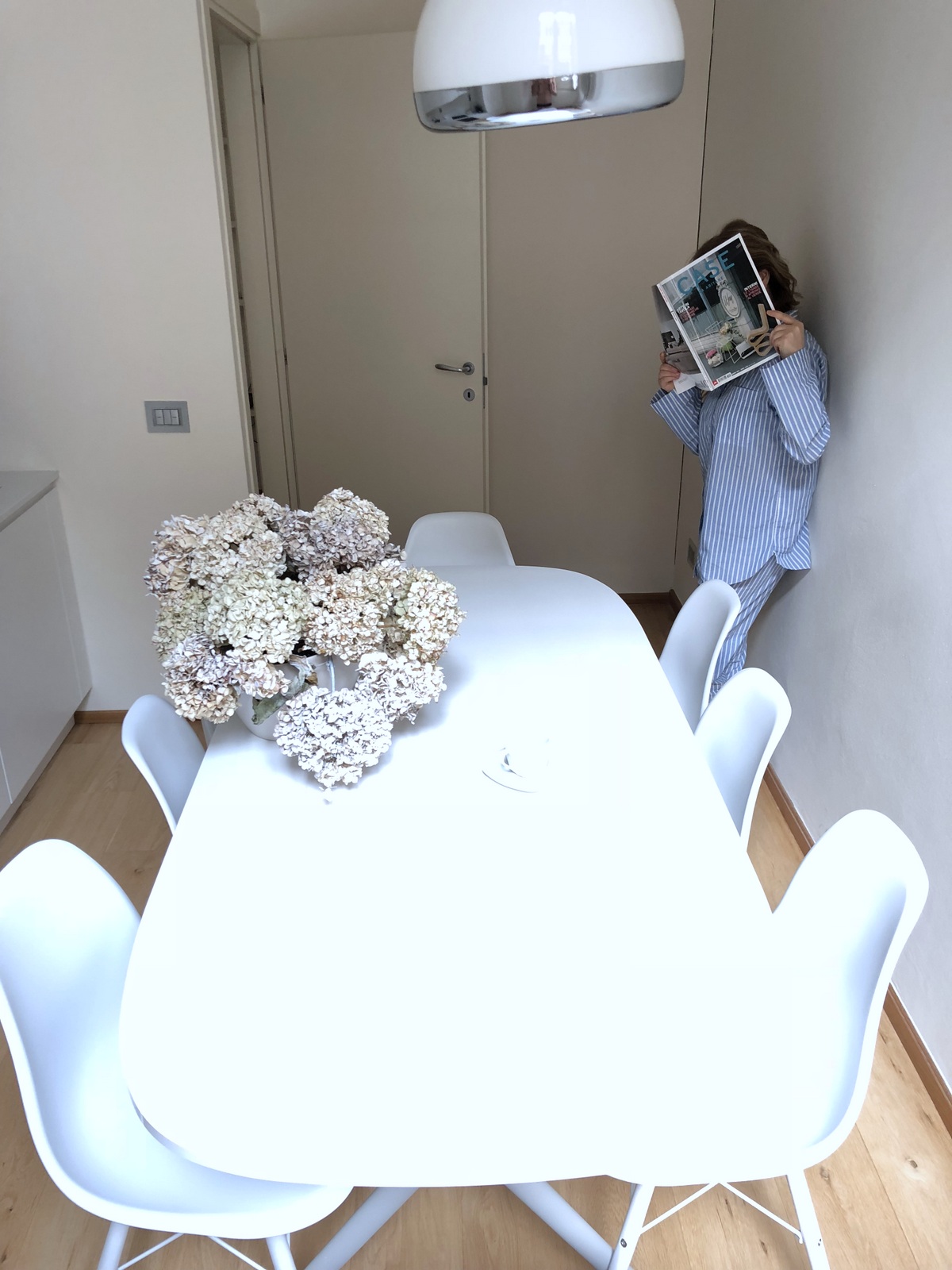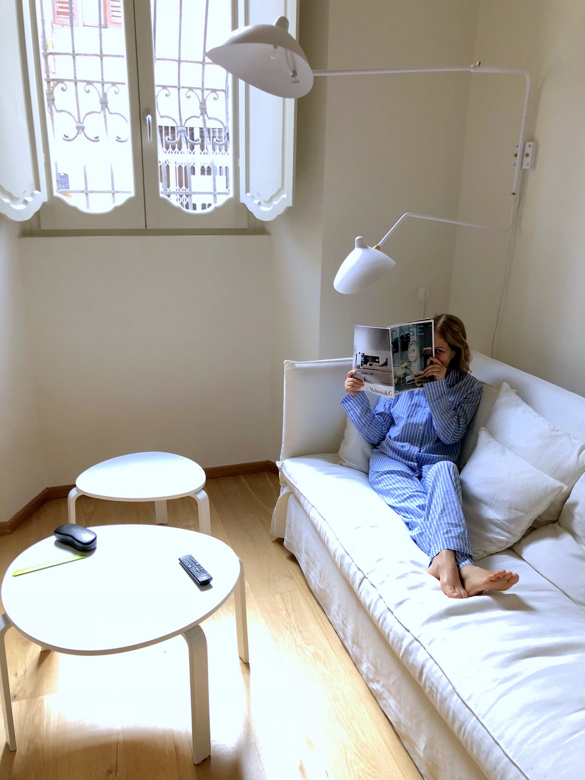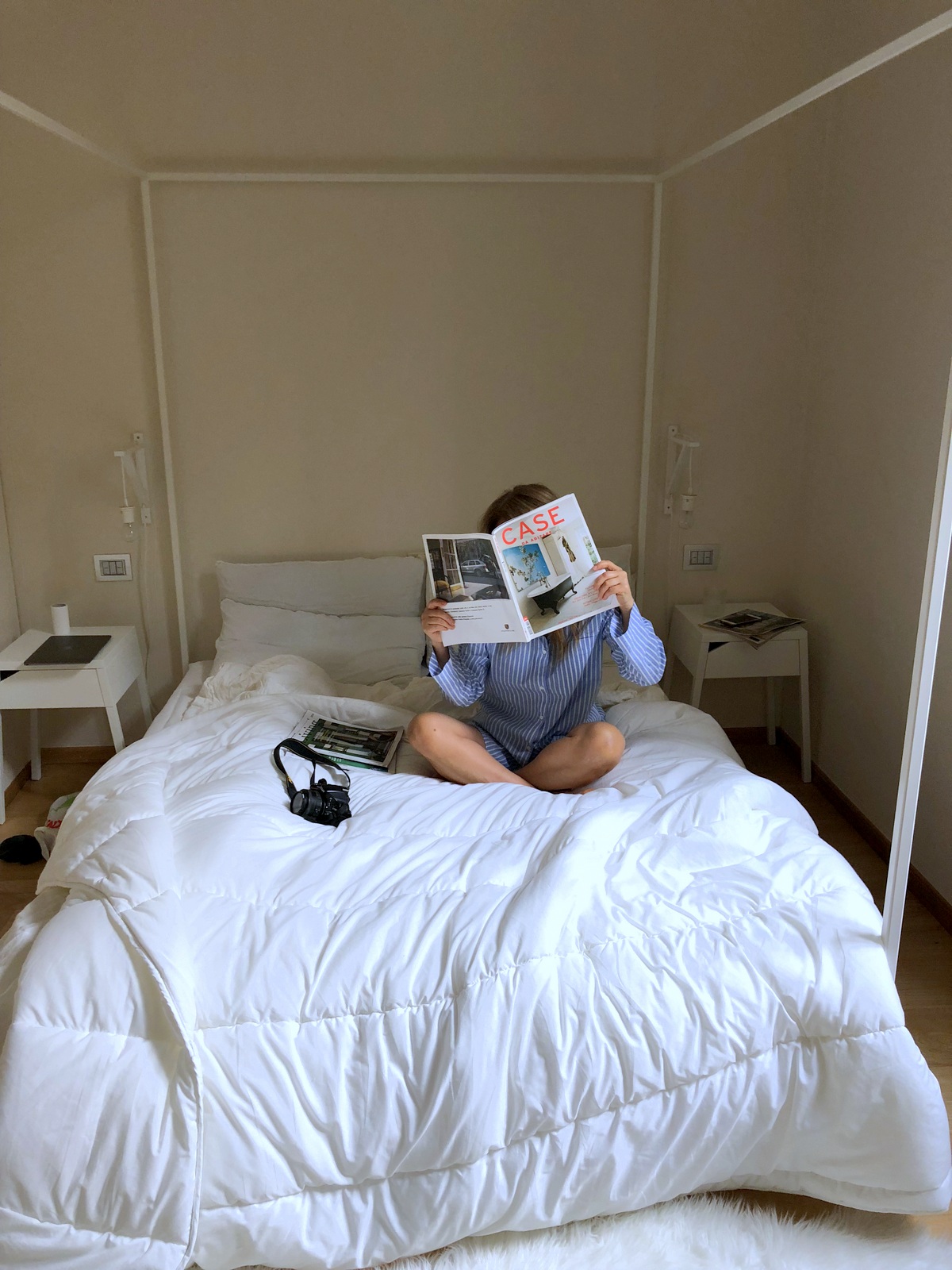 Vi mostro alcune stanze in cui mio marito mi ha scattato alcune foto in maniera ironica, con me che divoro tutte le riviste di architettura presenti. Dal vivo lo spettacolo è davvero intrigante!