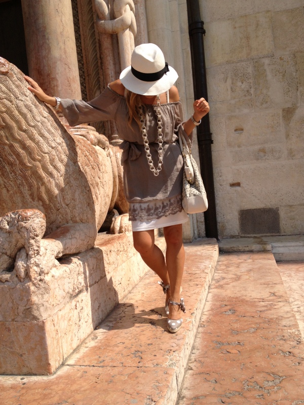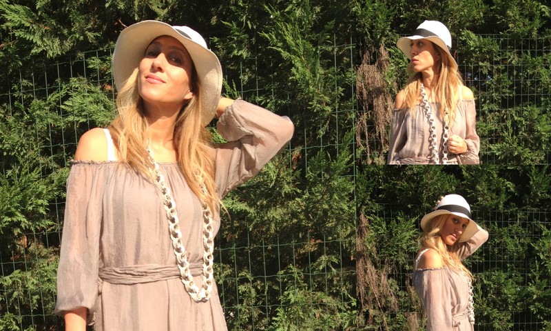 Mi lascio sfiorare dalla leggerezza di questo abito minimal color tortora, che si confonde con i colori della natura dominante e con il bianco della sottoveste e del mio panama…che conservo gelosamente perché e mio (FedericamorettiHandmade)!