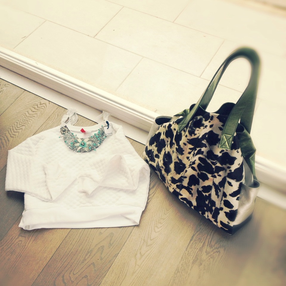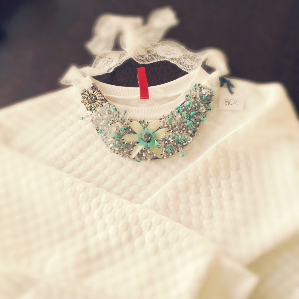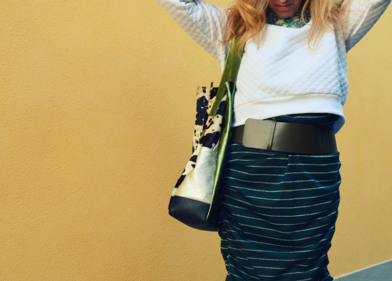 La felpa reinventata in “come tu mi vuoi” è il muovo must have della moda. Eccone una fra le tante: bianca crop (di quelle corte che fanno vedere la pancia). L’ho presa da H&M con 20% di sconto la sera dell’inaugurazione. Come abbinarla? In tantissimi modi. Io ho scelto subito una collana D.A.W che stesse bene, ho ancora il cartellino attaccato del prezzo, lo so purtroppo mi dimentico di togliere le etichette e spesso vado in giro con i cartellini attaccati finché qualcuno non me lo ricorda.