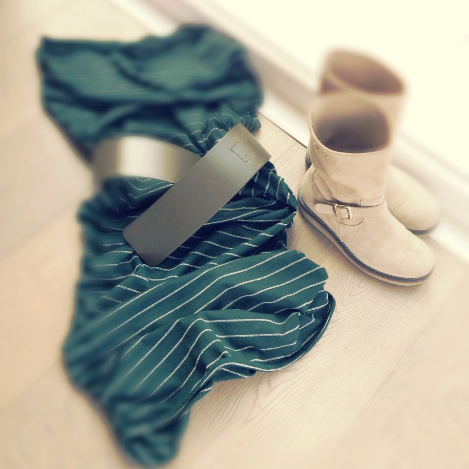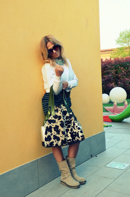 Poi ho giocato sui colori della collana e dal mio guardaroba ho scelto un abito di PB verde foresta di qualche anno fa a cui ho abbinato un cinturone dello stesso colore e un paio di boots in tela di TS anche questi comprati qualche anno fa e usati pochissimo, infatti sono praticamente nuovi. La mia nuovissima “TUA” bewhy patchwork cow ci sta benissimo. Che ne dite? Buona giornata a tutti la mia sarà bellissima dopo i baci di mia figlia!!