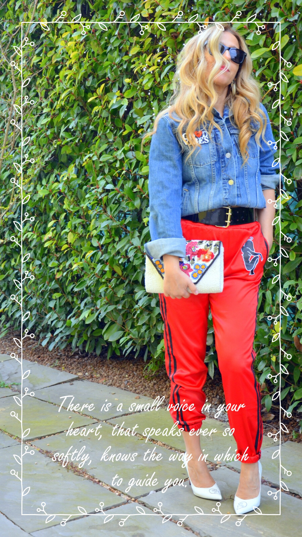 Un look perfetto per un outfit casual. Una giacca di jeans portata a pelle, una clutch scintillante, due tacchi bianchi #StayMercury e il famoso pantalone sporty chic in raso rosso passione. Le stampe del diavoletto e dell’angioletto in versione girly sono proprio indicative del rosso passione. Ma non solo. La mia frase di payoff di apertura, con cui ho iniziato questo post, firmando la prima foto, si riferisce proprio alle vocine di questi due personaggi che dovrebbero guidarci, dal profondo delle nostre coscienze, sussurrandoci frasi a volte incomprensibili. Sono due vocine spesso in lotta fra loro. Spesso incoerenti e in contraddizione.
