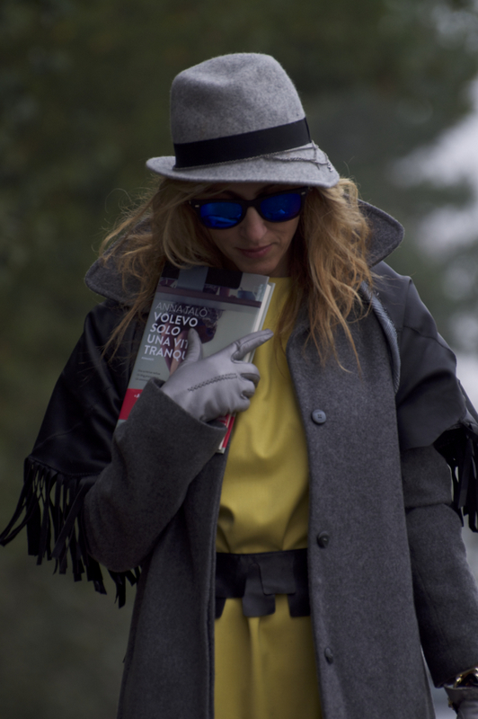 Il binomio di colore giallo/grigio è uno dei miei preferiti, il cappotto è splendido e guanti e clutch danno veramente un tocco particolarissimo al tutto.