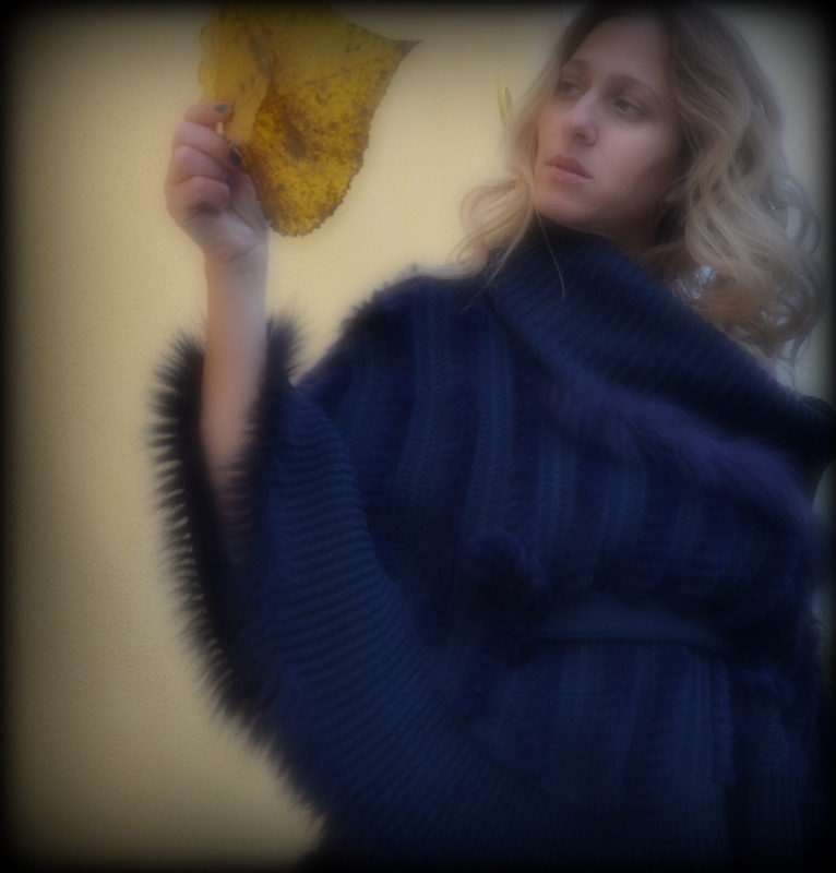 Adoro questo poncho blu di in lana con gli orli di un leggero di pelo sintetico che mi avvolge per l’intera lunghezza del corpo e si chiude in vita con una cintura.