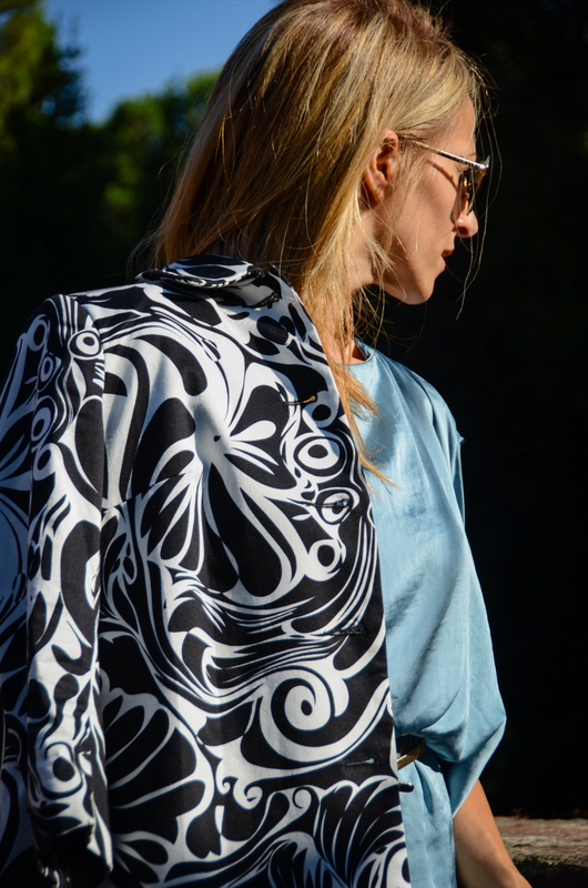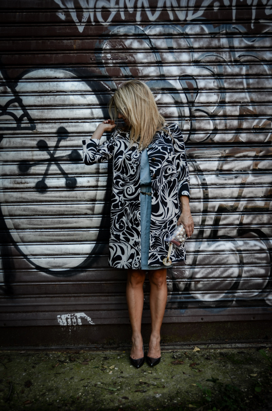 Finisco con il soprabito super avvolgente nel suo stile neo retrò, con stampa black and white che si sposa con il contesto e interrompe con forza il romanticisimo dell’abito.