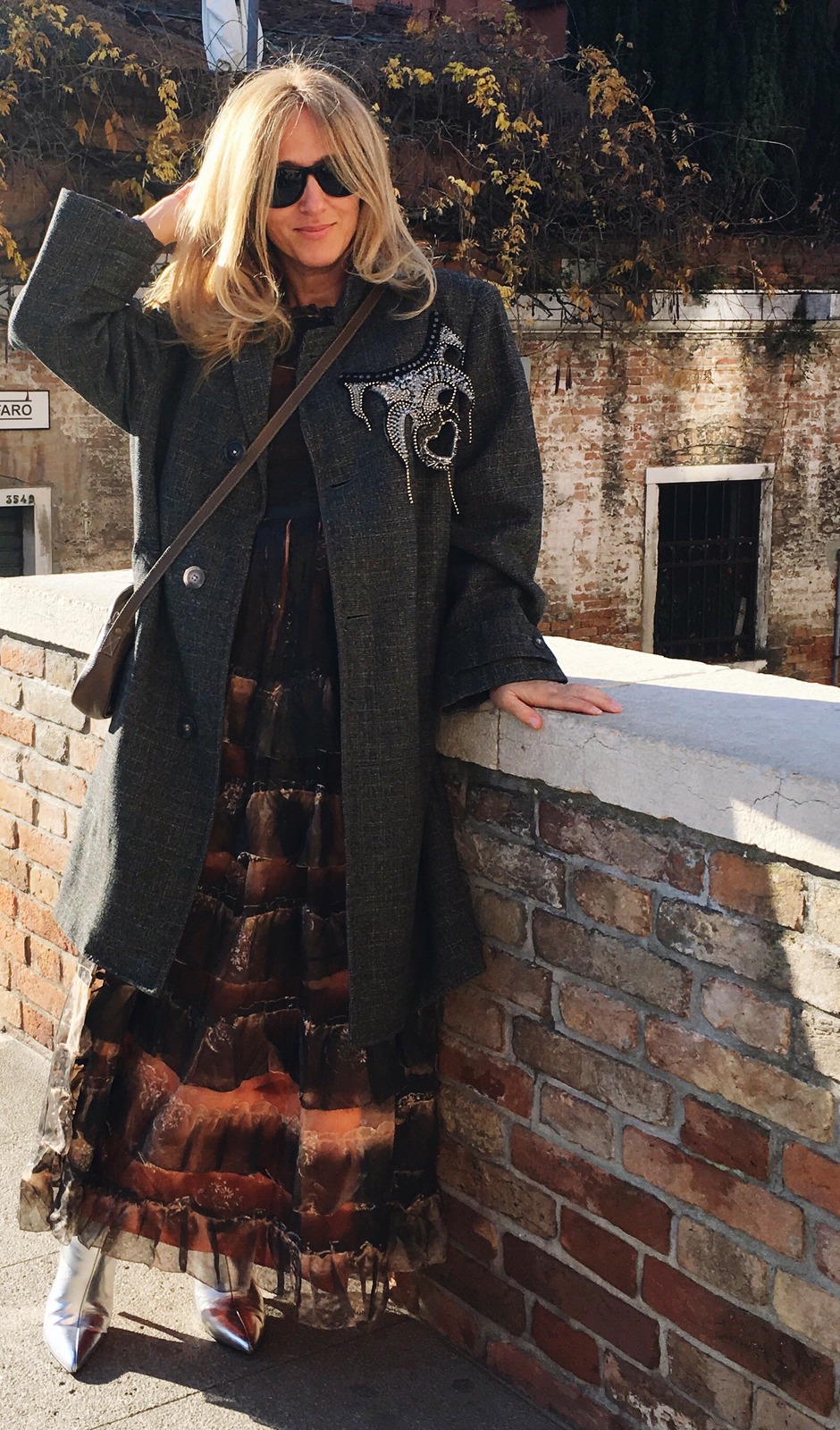 Sguardo aperto, la giornata è bellissima. Il cielo è azzurro intenso. Impariamo a leggere le città che odorano di bellezza. Spazi che si chiudono nel dedalo delle calli per poi riaprirsi sulla laguna. Una città potente che dall’alba al tramonto si veste di un delirio di colori indefinibili. Ho deciso di percorrerla con un long dress sperimentale, interamente a balze con ricami, su un paio di tacchi che, vi dirò con tutta onestà che erano comodissimi e li ho portati per tutto il giorno. In fondo se decidi di passeggiare per Venezia, ma non vuoi fare la turista non puoi indossare le sneakers. Il mio cappotto oversize dal taglio sartoriale con collana scenografica sul bavero mi ha permesso di poter essere osservata da tutti i turisti face to face, quasi fossi una opera d’arte. Appena riesco vi parlerò del mio pranzo all’Harry’s bar: memorabile!