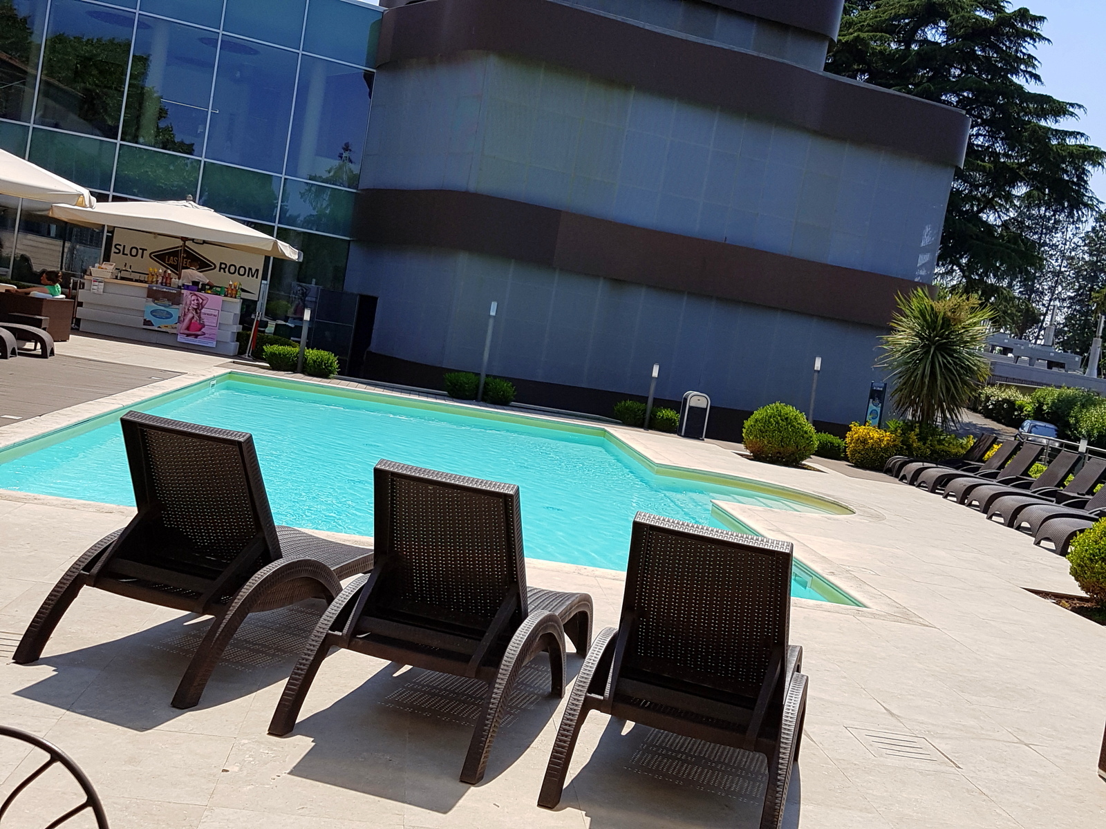 Una intera suite a mia disposizione, con una mega finestra di fronte al letto che si affaccia sulla piscina e da cui si vede Roma…