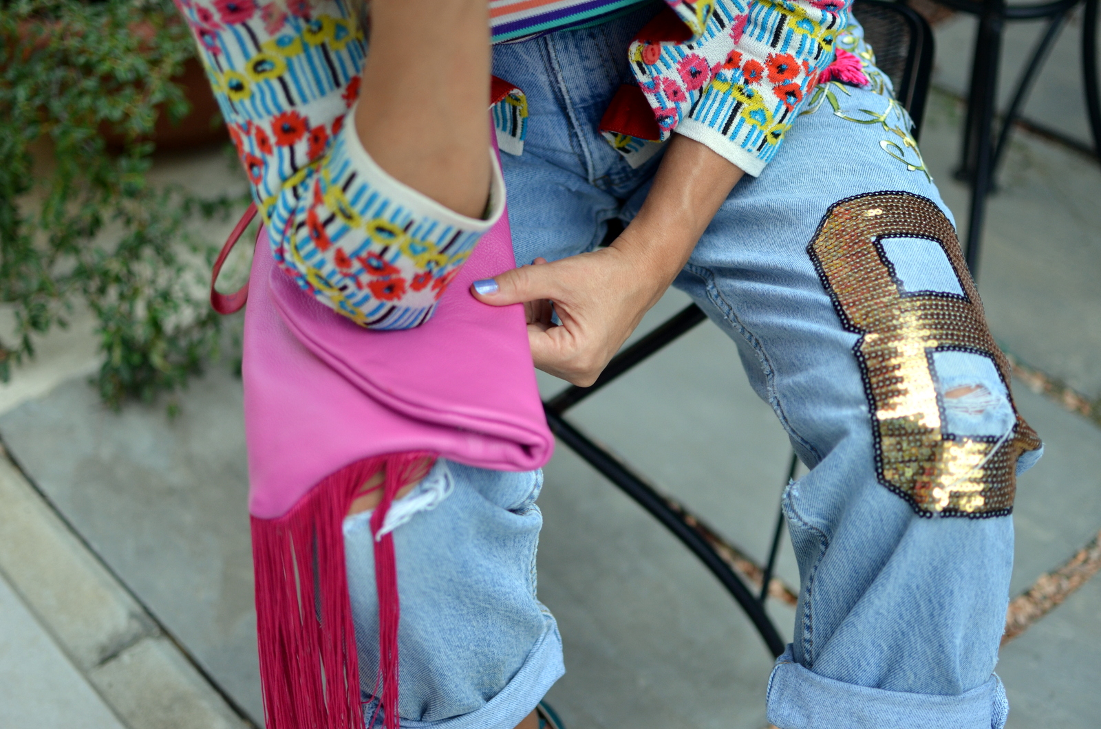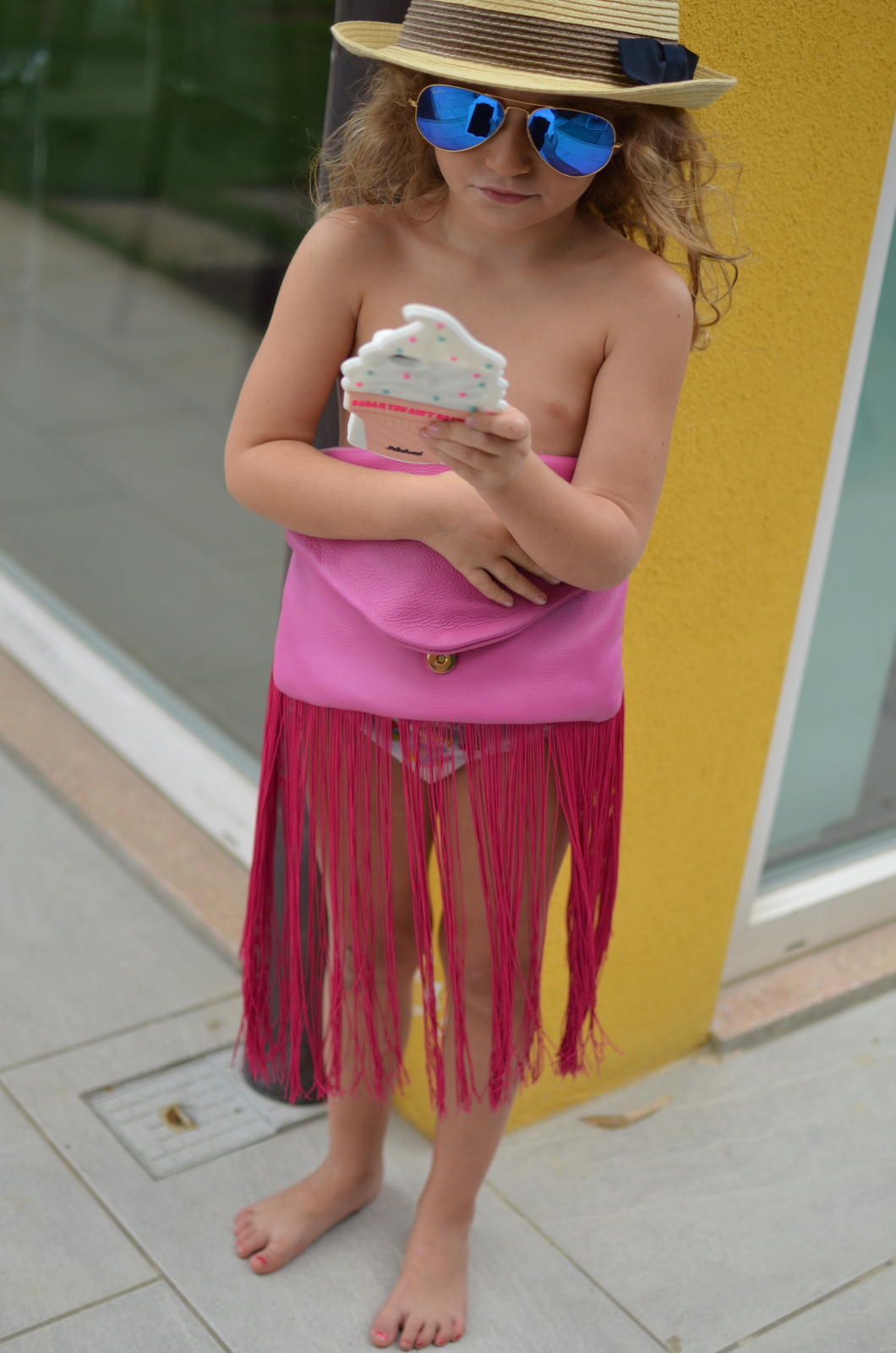 Una clutch con frange in volo di un fucsia intenso che non poteva certo sfuggire allo sguardo della mia piccola che me l’ha rubata per farsene un gonnellino hawaiano.