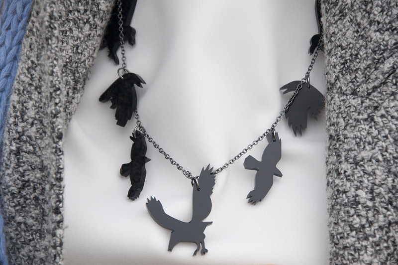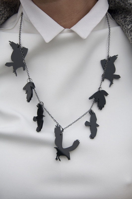VincaUSA di Amanda Dimova è il design eccentrico per tutti quelli che non vogliono annoiarsi. Accessori e bijoux in legno e acrilico, tagliati e assemblati in una casa del Texas (Austin) in una specie di “micro -manufacturing ” che produce grandi quantità da soddisfare una grossa fetta del mercato mondiale. Li conoscete? Vendono on line e ho comprato i miei corvi che urlano di gioia con una piuma sul retro.